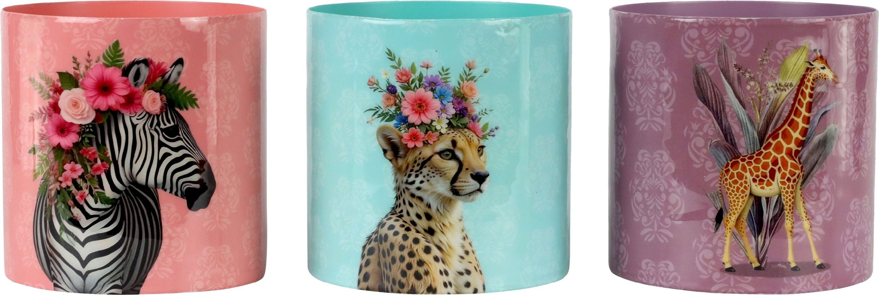 Bringen Sie Farbe und exotischen Charme in Ihr Zuhause mit dem 3-teiligen Übertopf-Set Savanna dreams von FURNARO. Jedes Gefäß ist aus robustem Eisen gefertigt und begeistert durch ein individuelles Tiermotiv -Zebra, Gepard und Giraffe -jeweils verziert mit floralen Elementen auf farbenfrohem Hintergrund in Apricot, Mint und Lila. Die glänzende Oberfläche verleiht jedem Topf eine hochwertige Anmutung, während die Maße von Ø12,5 cm und 13 cm Höhe vielseitige Einsatzmöglichkeiten für kleine bis mittelgroße Pflanzen bieten. Ob als stilvolle Dekoration auf dem Sideboard, im Regal oder als Geschenkidee -das Set überzeugt durch Design, Funktionalität und Originalität.