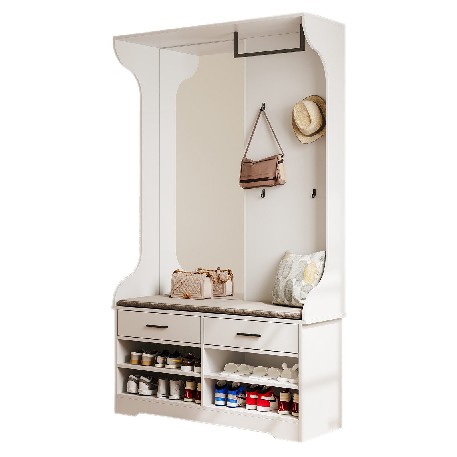 Unsere weiße Holzgarderobe bietet vielfältige Aufbewahrungsmöglichkeiten, darunter ein Schuhregal, zwei Schubladen, vier Haken, einen Spiegel, eine Schuhbank und vieles mehr. Der große Spiegel ermöglicht Ihnen einen schnellen Blick auf Ihr Outfit, bevor Sie losgehen. Dieser vielseitige Stauraum bietet Platz für Kleidung, Hüte, Schuhe, Schals und mehr. Diese moderne, minimalistische Garderobe kann überall platziert werden – an der Haustür, im Schlafzimmer, im Schrank und mehr. Sie ist praktisch und schön zugleich.