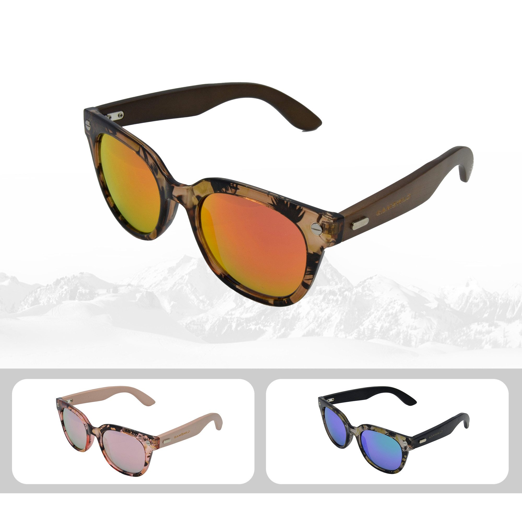 Voll im Trend mit dieser außergewöhnlichen Sonnenbrille. Das Modell zeichnet sich durch eine traumhaft schöne und zugleich moderne Optik aus. Durch ihre halbtransparente Fassung und den breiten Bambusholzbügel wird diese Modebrille zu einem echten Highlight. Neben einer sehr hochwertigen Haptik sind bei der WM1328 auch hochwertige Metallscharniere in die Bügel eingelassen. Die wunderschöne Damenbrille ist in drei tollen Farbvarianten erhältlich. Всі Варіантиn besitzen verspiegelte Gläser mit einem cat. 3 Tönungsgrad. Geliefert wird die Brille in einem schicken Microfasersackerl.