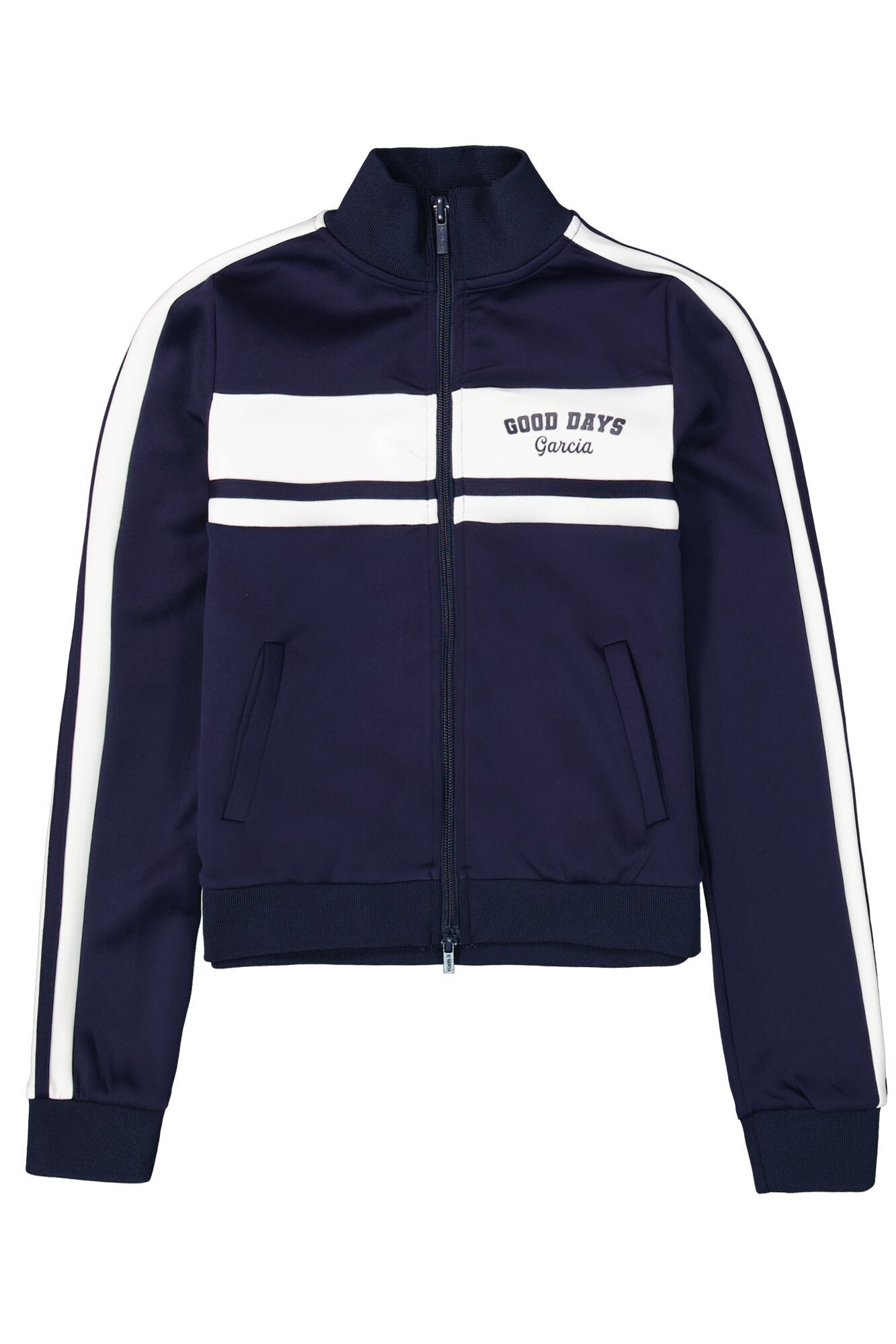 Die Garcia Sweatjacke für Mädchen ist ein vielseitiges Kleidungsstück, das sich sowohl für sportliche Aktivitäten als auch für die Freizeit eignet. Sie besteht aus einer komfortablen Materialmischung mit 78 % Polyester, 15 % Viskose und 7 % Elasthan und bietet eine optimale Passform bei gleichzeitig einfacher Pflege. Das Design in Dunkelblau mit kontrastreichen Streifen und einem auffälligen "Good Days" Schriftzug ist modern und ansprechend. Der Stehkragen und die Rippstrickbündchen unterstreichen den sportlichen Look. Die Jacke kann alleine als Sweatjacke getragen oder mit der passenden Hose als Trainings- oder Freizeitanzug kombiniert werden. Sie ist ideal für den Sportunterricht, einen Stadtbummel oder gemütliche Tage zu Hause und wird schnell zum Favoriten im Kleiderschrank eines jeden Mädchens.