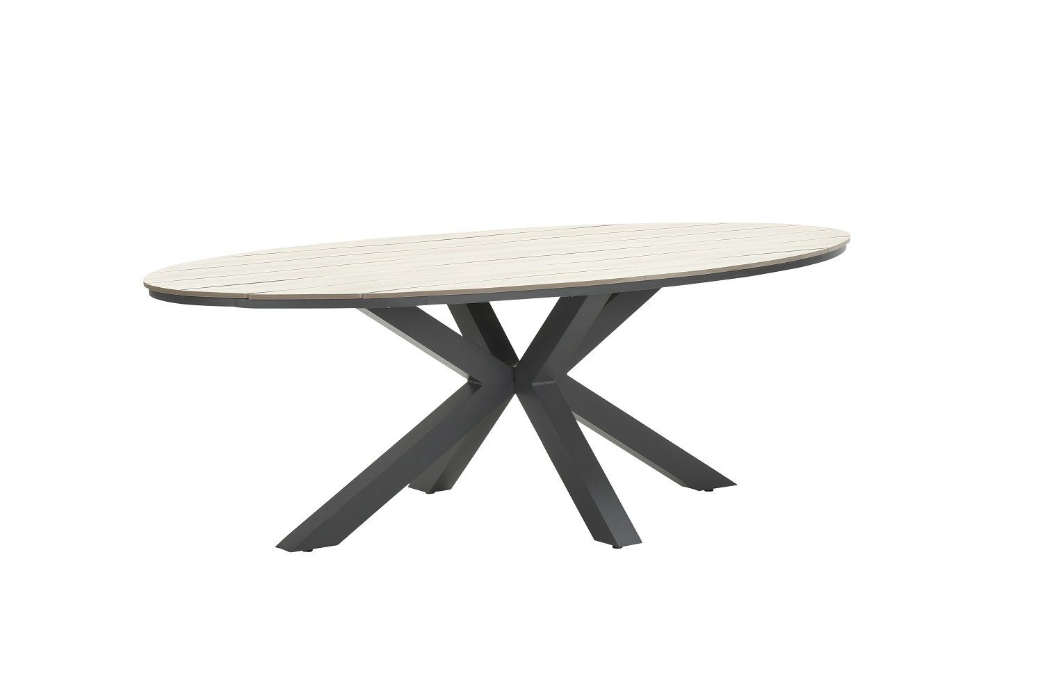 Die Tischplatte besteht aus einer hochwertigen, witterungsbeständigen und besonders pflegeleichten Nonwood-Oberfläche in der Farbe hellgrau.