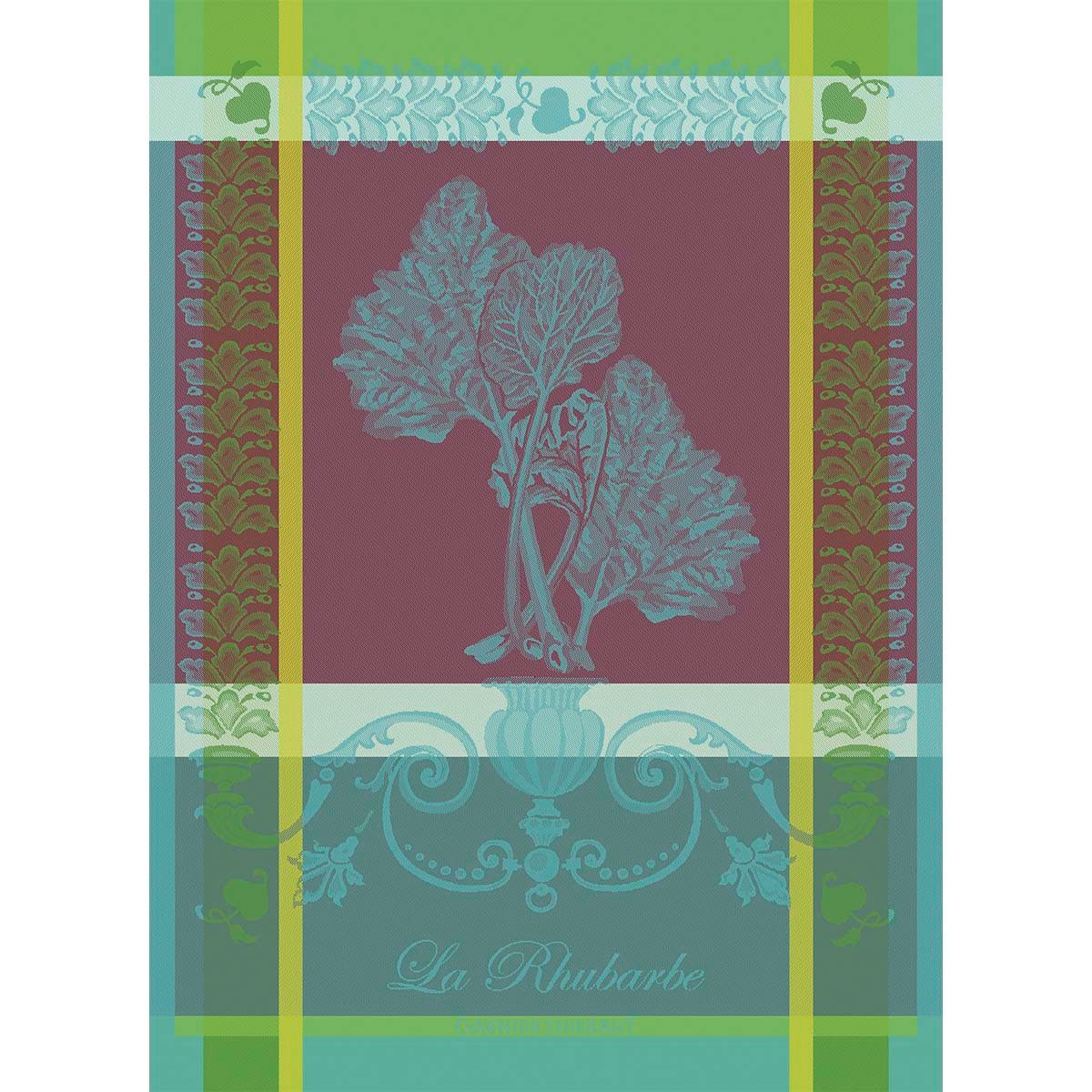 Pflegehinweise | MotivbeschreibungDieses Geschirrtuch zeigt ein stilisiertes Rhabarbermotiv in einem Vintage-Stil. Die Farbpalette ist eine harmonische Mischung aus tiefem Burgunderrot, Türkis und Grün, ergänzt durch Akzente in Gelb und Hellblau. Das Design ist in vertikale Streifen unterteilt, wobei der zentrale Streifen das Rhabarbermotiv auf burgunderrotem Hintergrund zeigt, während die seitlichen Streifen und der untere Bereich mit dekorativen Mustern und dem Schriftzug La Rhubarbe verziert sind. |
