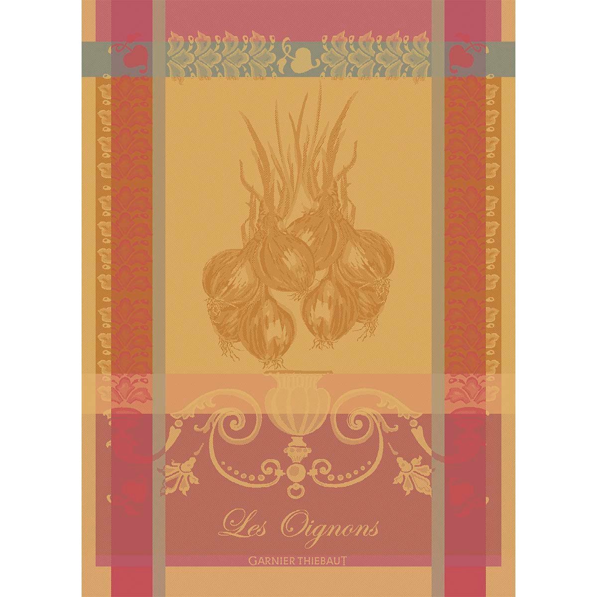Pflegehinweise | MotivbeschreibungDieses Geschirrtuch zeigt ein Bündel Zwiebeln, das mit dem französischen Text Les Oignons und dem Markennamen GARNIER THIEBAUT verziert ist. Das Design ist in warme Gelb-, Orange- und Rottöne getaucht, die an die erdigen Farben von Zwiebeln und die Wärme einer Küche erinnern. Die vertikalen Streifen und die dekorativen Ornamente verleihen dem Stück einen Hauch von Eleganz und Raffinesse. |