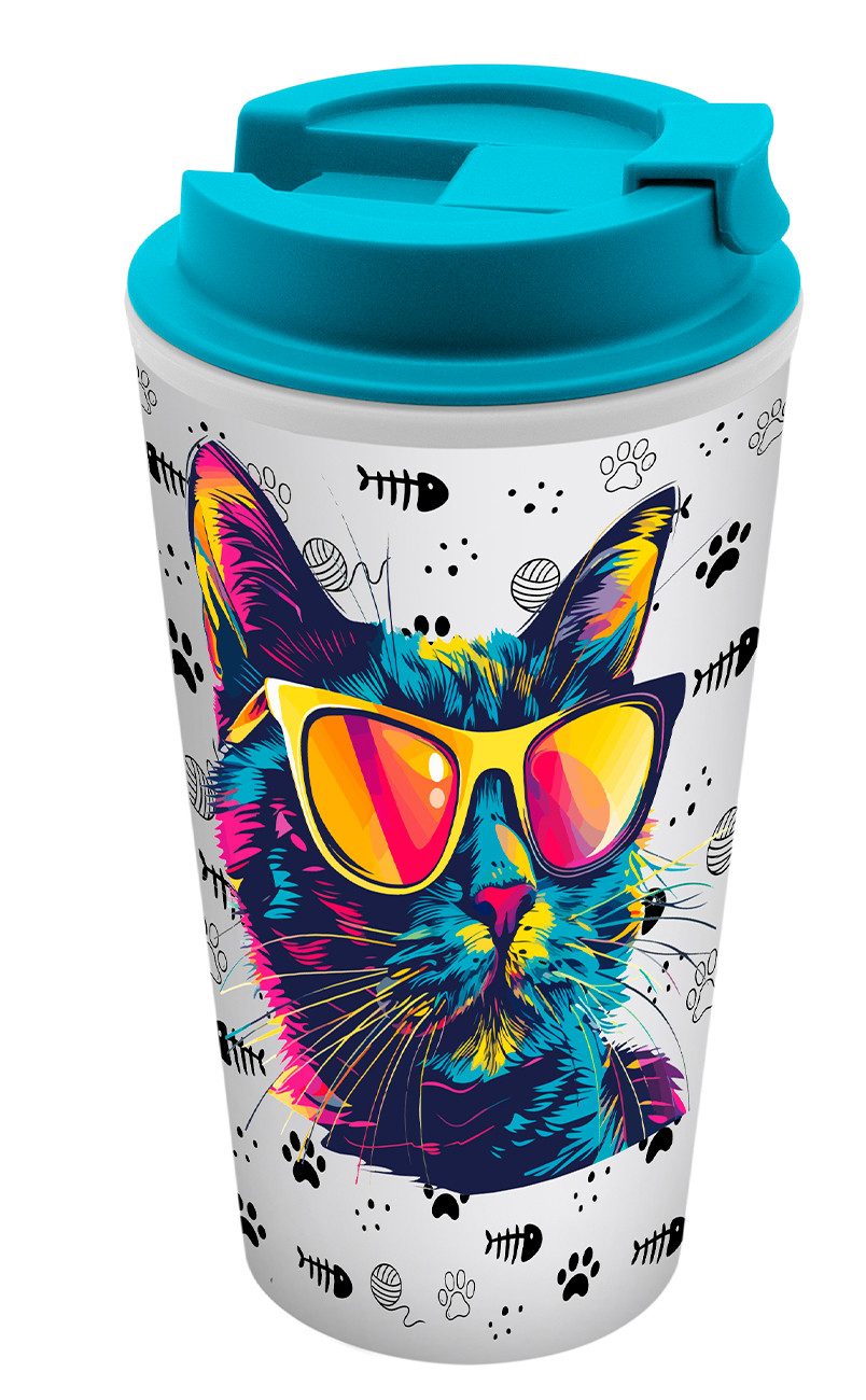 Der Coffee to go Becher Cool Cat besteht aus PP und hat ein Fassungsvermögen von 400ml. Das coole Design mit der frechen Katze mit Sonnenbrille ist perfekt für Unterwegs, ob ins Büro, die Uni oder die Schule. Nicht nur optisch macht der Becher was her, auch die Eigenschaften des doppelwandigen Isolierbechers sind nicht zu unterschätzen. Der Coffee to go Becher in leuchtendem Türkis hält den Kaffee, Tee oder Kakao durch die doppelwandige Isolierung lange warm. Zusätzlich ist der Inhalt durch die Silikondichtung und die Verschlusskappe geschützt und durch den Deckel können keine Insekten in das Getränk gelangen.