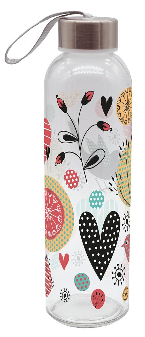 Die Trinkflasche Blumen 500ml versprüht Lebendigkeit und Lebensfreude. Das bunte Design aus Blumen und Herzen ist der perfekte Alltagsbegleiter. Du kannst Kaltgetränke, aber auch warmen Tee in die Flasche einfüllen. Aber Vorsicht: Die Glasflasche wird heiß! Der silberne Drehverschluss verfügt über eine praktische Trageschlaufe. Mit 500ml Fassungsvermögen für dein Wellness-Wasser, deinen Yogi-Tee oder deinen Smoothie ist die Glastrinkflasche ein guter Begleiter für die Schule, Uni, das Büro oder einfach für unterwegs.