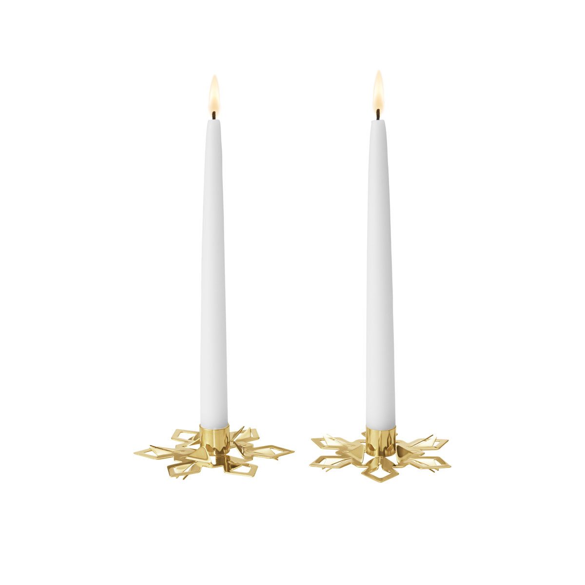 Georg Jensen - Spitzkerzenhalter-Set Schneeflocke 2024, vergoldet Auch 2024 ist die in Dänemark geborene Sanne Lund Traberg für die jährlich mit viel Spannung erwarteten Weihnachtssammlerstücke verantwortlich. Die Designerin Sanne Lund Traberg hat in der Weihnachtskollektion 2024 die Elemente einer klirrend kalten Winternacht nachgebildet und sich von der Magie der Landschaft in dieser Jahreszeit inspirieren lassen. Leuchtende Sterne, ein glühender Mond und glitzernde Schneeflocken vermitteln ein harmonisches Gefühl von Ruhe und Gelassenheit. Jedes Stück der Kollektion sorgt für eine atemberaubende Dekoration, die jeden Winkel Ihres Hauses für jede kommende Weihnacht erhellen wird. Für eine einzigartige Weihnachtsdekoration in diesem Jahr und darüber hinaus! Die Weihnachtsornamente von Georg Jensen werden in einem aufwendigen Prozess entweder mit 18k Gold oder Palladium plattiert. Bitte beachten: Die Kerzenhalter sind NICHT geeignet für Kerzen in Standard-Größe, sondern nur für Spitzkerzen mit kleinerem Durchmesser!