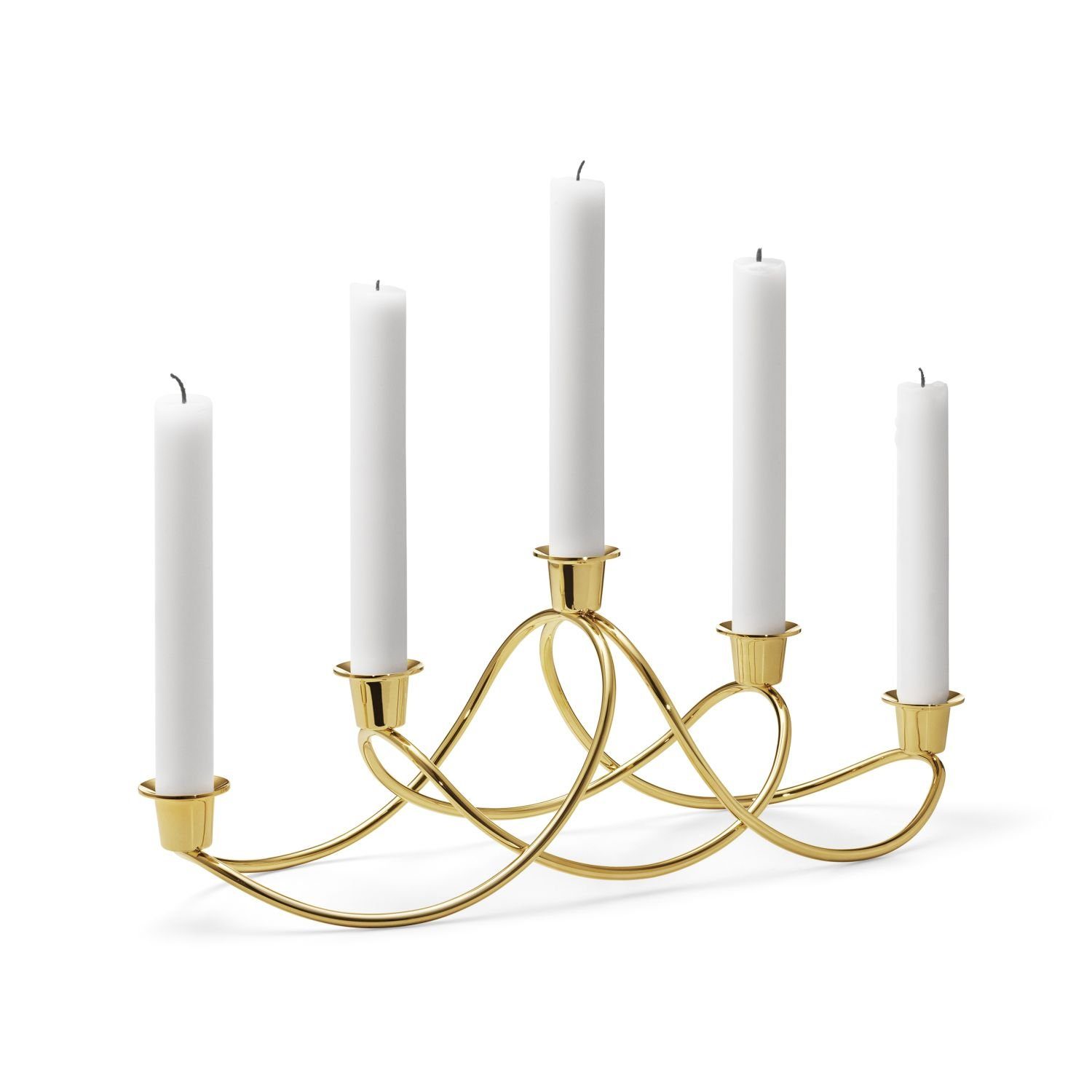 Der Kerzenhalter Harmony im Design von Maria Berntsen für Georg Jensen bietet Platz für fünf Stabkerzen und schafft eine festliche und gemütliche Atmosphäre. Mit seiner schmalen, länglichen Form findet er auch auf gedeckten Tafeln oder auf der Fensterbank Platz und kann Jahr für Jahr seinen dekorativen Glanz verströmen. Der Kerzenhalter besteht aus Edelstahl, das mit einer 18-karätigen Goldauflage versehen ist. So wirkt der Kerzenschein besonders warm und feierlich. Der Kerzenhalter Harmony ist 14,3 cm hoch und 41,9 cm lang.