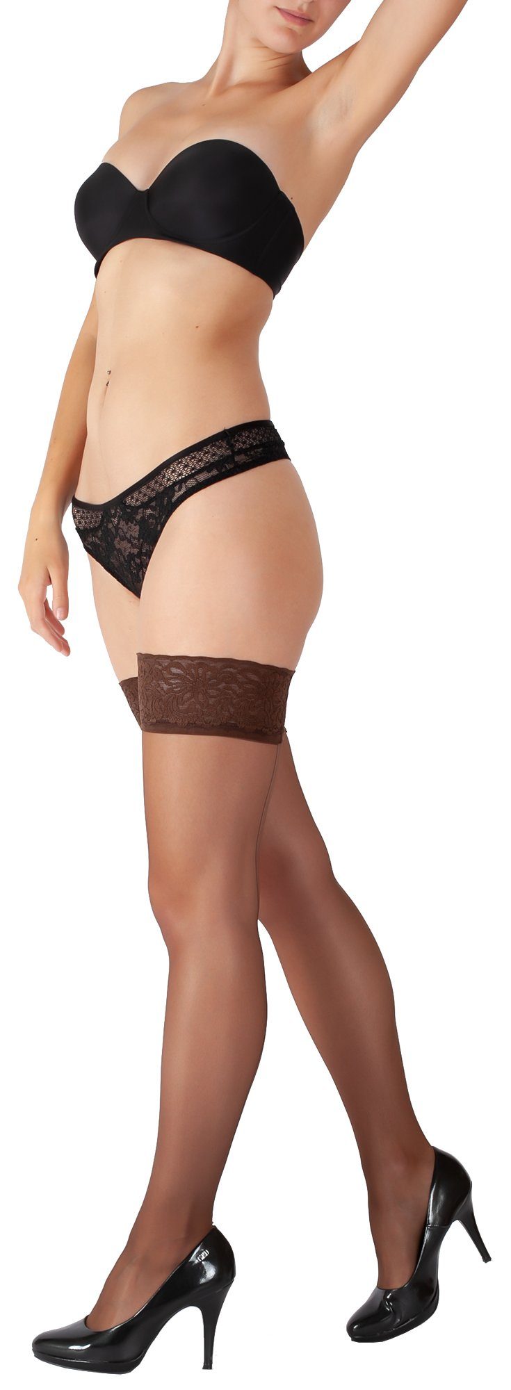 Unsere Halterlosen Nahtstrümpfe mit Spitze sind das perfekte Accessoire, um Ihre Weiblichkeit und Sinnlichkeit zu betonen. In Kombination mit High Heels werden Sie Ihr Selbstbewusstsein steigern und bewundernde Blicke auf sich ziehen. Diese Strümpfe verkörpern pure Eleganz und verleihen Ihrem Look einen Hauch von Glamour.