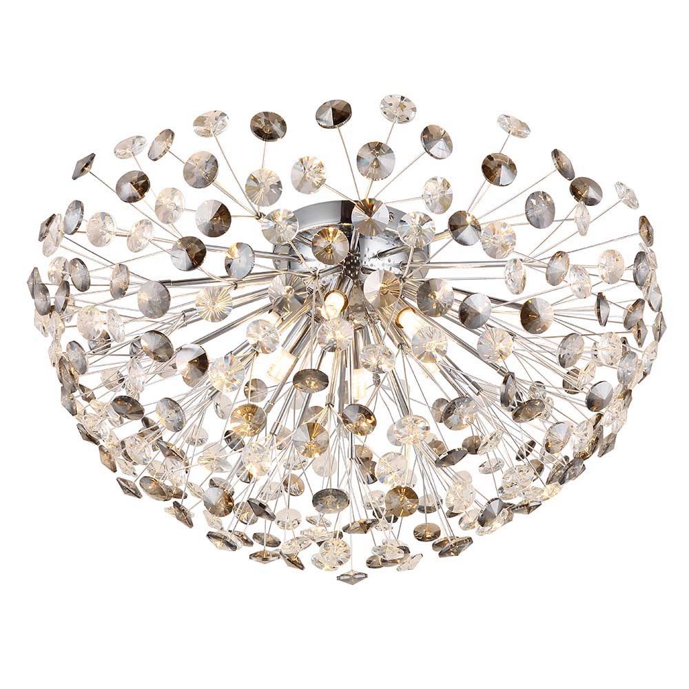 Die Deckenleuchte 'KATRINA' vereint klassisches Design mit moderner Eleganz. Ihr runder, halbkugelförmiger Schirm aus rauchfarbenen und klaren K9 Kristallen bietet nicht nur eine beeindruckende Lichtbrechung, sondern auch ein stilvolles Äußeres. Der Korpus aus verchromtem Metall unterstreicht die hochwertige Verarbeitung und verleiht der Leuchte einen edlen Glanz. Ausgestattet mit 6XG9 LED-Lampen strahlt die Deckenleuchte warmweißes Licht mit einer Farbtemperatur von 3000 K aus und erzeugt einen Output von 350 Lumen. Diese Kombination aus Lichtqualität und Design macht sie ideal für den Einsatz in Wohnräumen, Fluren oder Schlafzimmern, wo sie nicht nur als Lichtquelle dient, sondern auch als dekoratives Element wirkt. Die 'KATRINA' ist eine perfekte Wahl für alle, die klassische Ästhetik mit moderner Technologie und hochwertigen Materialien schätzen.