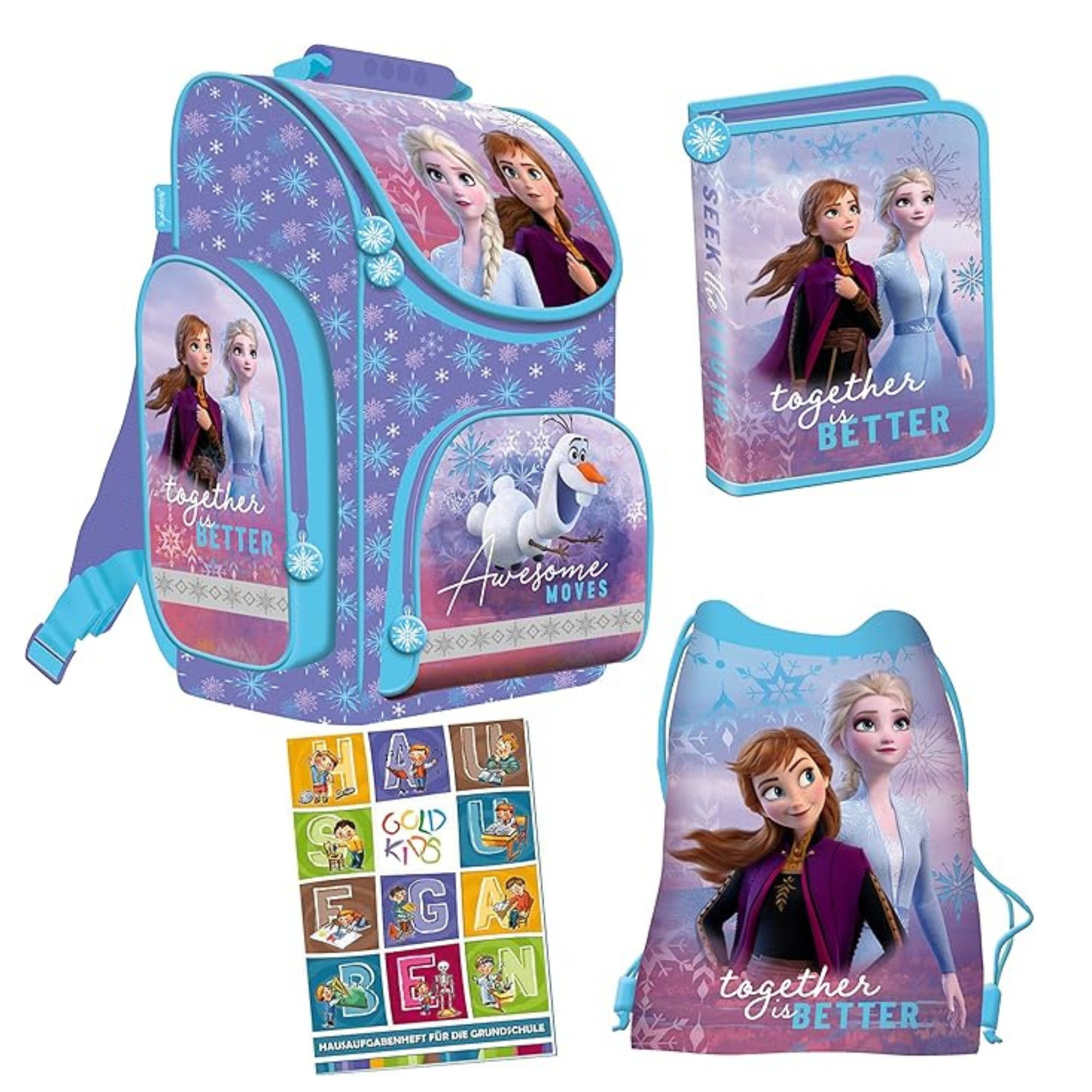 1. Schulranzen ca. 36 x 19 x 30 cm - Großes Hauptfach mit dreifacher Unterteilung für Hefte und Bücher - der Zwei-Wege-Reißverschluss mit Anhänger - die praktische, isolierte Vordertasche für Brotdose oder Etui - eine Seitentasche mit Reißverschluss und eine Seitentasche mit Gummizug für Trinkflasche etc. - reflektierende Elemente für bessere Sichtbarkeit. - verstellbare Trageriemen und atmungsaktives Rückenpolster 2. Federmappe - 1 Hauptfach mit Reißverschluss - zwei Innenklappen mit integrierten Klarsichtfenstern - mit 28 elastischen Haltern und zwei großen Innenklappen für Stundenplan oder Kalender, ohne Inhalt 3. Turnbeutel - wasserabweisendes Material, robust, resistent gegen Feuchtigkeit. - dank doppelter Schulterriemen kann die Tasche sowohl über der Schulter als auch in der Hand getragen werden. - durch das Aufsetzen ziehen sch die Bänder zusammen und schließen somit den Beutel sicher. 4. Hausaufgabenheft A5,48 Blatt, bunter Innendruck - für die Grundschule geeignet. Die Wochentage sind jeweils mit unterschiedlichen Farben unterlegt, was eine Nutzung in der Grundschule ermöglicht und vereinfacht.