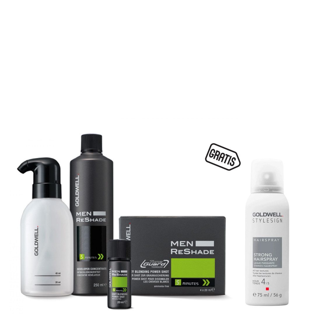Perfekte Grauhaar-Kaschierung in nur 5 Minuten! Das Goldwell Men ReShade Set bietet eine natürliche, ammoniakfreie Lösung für dezente, maskuline Farbauffrischung. Das Set enthält alles, was für die Anwendung benötigt wird: Men ReShade Developer Concentrate (250 ml) – Speziell für eine sanfte, gleichmäßige Farbabgabe Men ReShade Blending Power Shots (4 x 20 ml) – Für natürliche und unauffällige Graureduzierung Applikatorflasche (60 ml) – Für eine einfache, schnelle Anwendung Gratis dazu: Goldwell Stylesign Strong Hairspray (75 ml) für langanhaltenden, natürlichen Halt ohne Verkleben! Perfekt für: Männer, die erste graue Haare abdecken und ein frisches, gepflegtes Aussehen erhalten möchten. Jetzt bestellen & professionelles Styling genießen! POWER SHOTS ZUR GRAUKASCHIERUNG 4 kühl-aschige Nuancen (4CA, 5CA, 6CA, 7CA) Hybrid Foam Technology mit nur 5 Minuten Einwirkzeit Tone Guard Technology für eine konstant kühle Tonausrichtung ENTWICKLERKONZENTRAT Spezielle Entwicklerlösung für garantierte 5 Minuten Einwirkzeit MEN RESHADE APPLICATORFLASCHE Die Innovation im Männermarkt Die Farbkomponenten werden in der speziellen Applikatorflasche gemischt und dann als Schaum auf das Haar aufgetragen