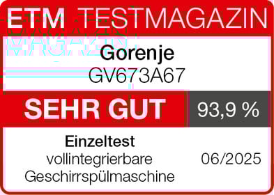 Der Gorenje GV673A67 erzielt im Einzeltest des „ETM TESTMAGAZINS“ das Gesamtergebnis „sehr gut (93,9 %)“. Die Reinigungs- und Trocknungsleistung ist sehr hoch. Die Anzeigen sowie die Spülprogramme sind „sehr gut“ und das Gerät ist einfach zu bedienen sowie ein- und auszuräumen. Außerdem sind der Strom- und Wasserverbrauch sowie der Schallausstoß sehr gering. Insgesamt ist das Modell „ein wahres Spülwunder“.
