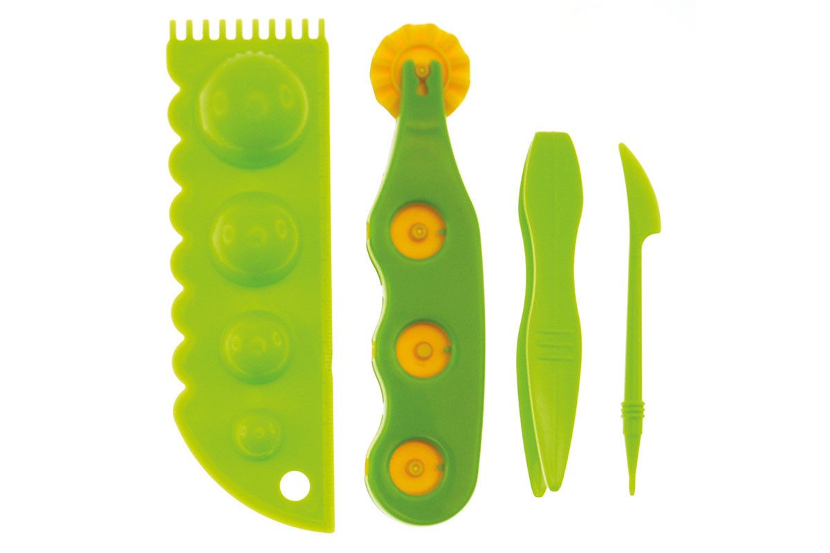 Ausstattung | Teigrolle, Spachtel, Messer, Musterschneider mit drei Aufsätzen |