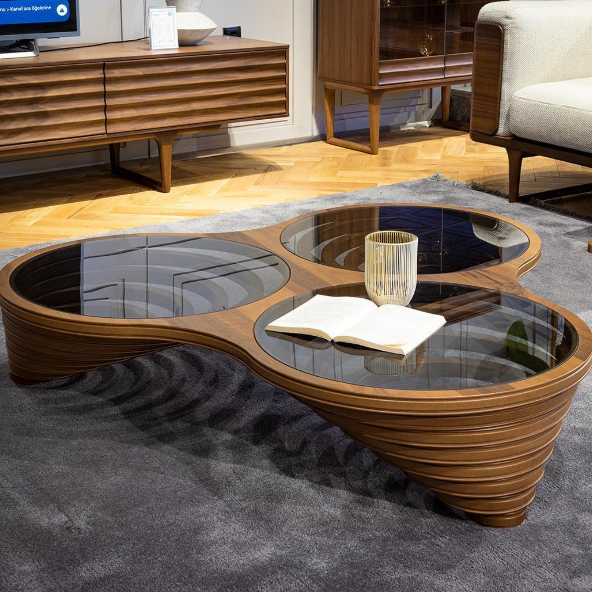 Die Galaxy Mittelkonsole vereint modernes Design mit praktischer Funktionalität und ist die perfekte Ergänzung für jedes stilvolle Wohnzimmer. Mit einer Kombination aus walnussfarbener MDF-Oberfläche, Glasplatte und gedrechselten Beinen bietet dieser Tisch sowohl ästhetische Schönheit als auch lange Haltbarkeit. Die feinen Details des verzierten MDF-Korpus und die eleganten Lichtreflexionen des Glasoberteils schaffen eine einladende Atmosphäre. Die Tischplatte und die Konstruktion gewährleisten eine einfache Reinigung und ein hohes Maß an Komfort durch die praktische Transportierbarkeit.
