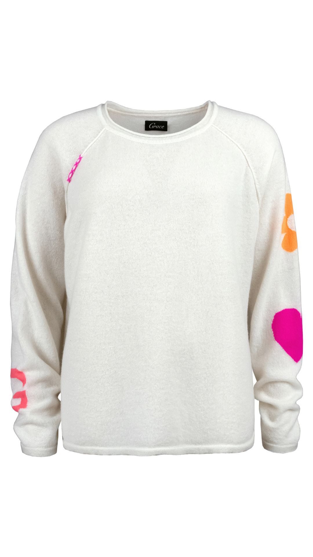 NEU Grace NEU . lässiger Pullover, Lurex, mit Aufdruck an den Ärmeln, lange Ärmel, Rundhalsausschnitt. . Farbe: weiß (102 offwhite) Material : 77% Wolle, 13% Kaschmir, 10% Lurex.
