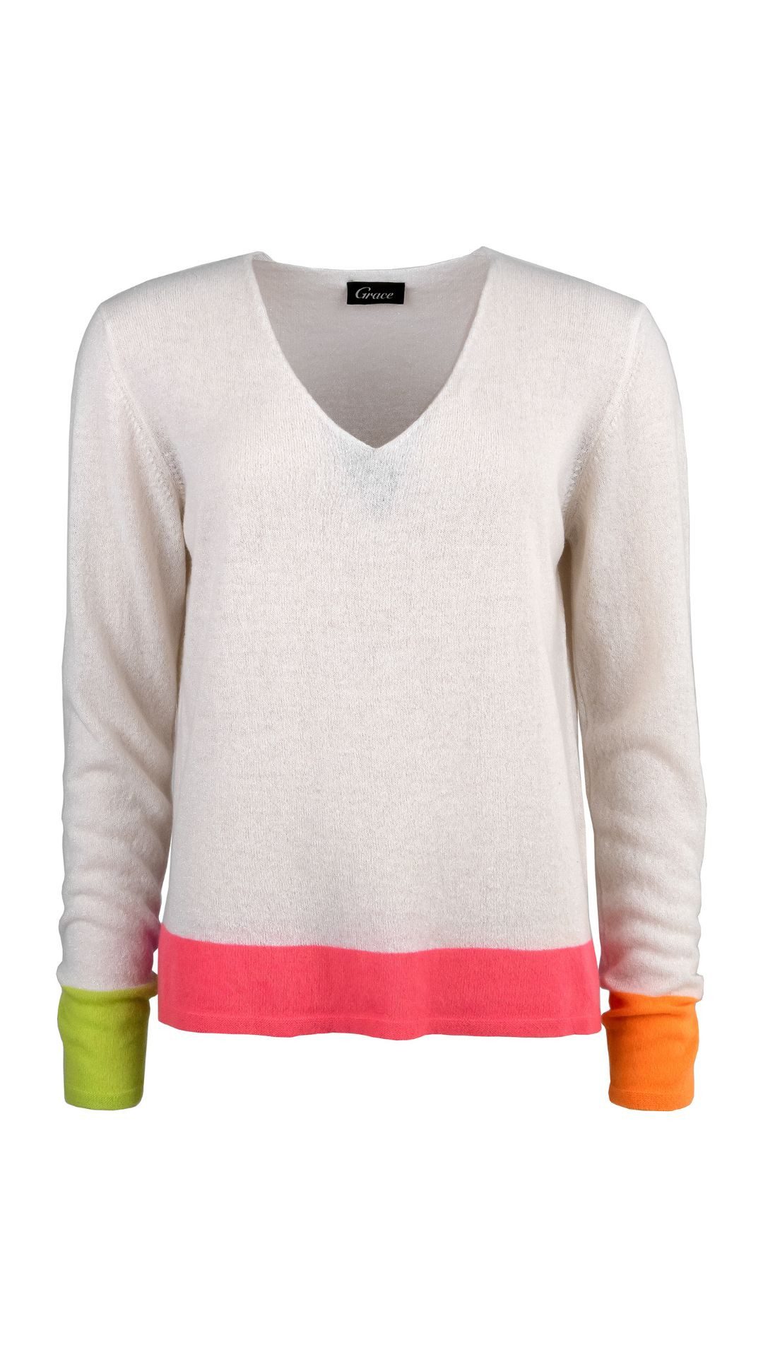 NEU Grace NEU . lässiger Pullover, Lurex, mit Farbstreifen an den Ärmeln / Bund, lange Ärmel, V-Ausschnitt. . Farbe: weiß (102 offwhite) Material : 77% Wolle, 13% Kaschmir, 10% Lurex.