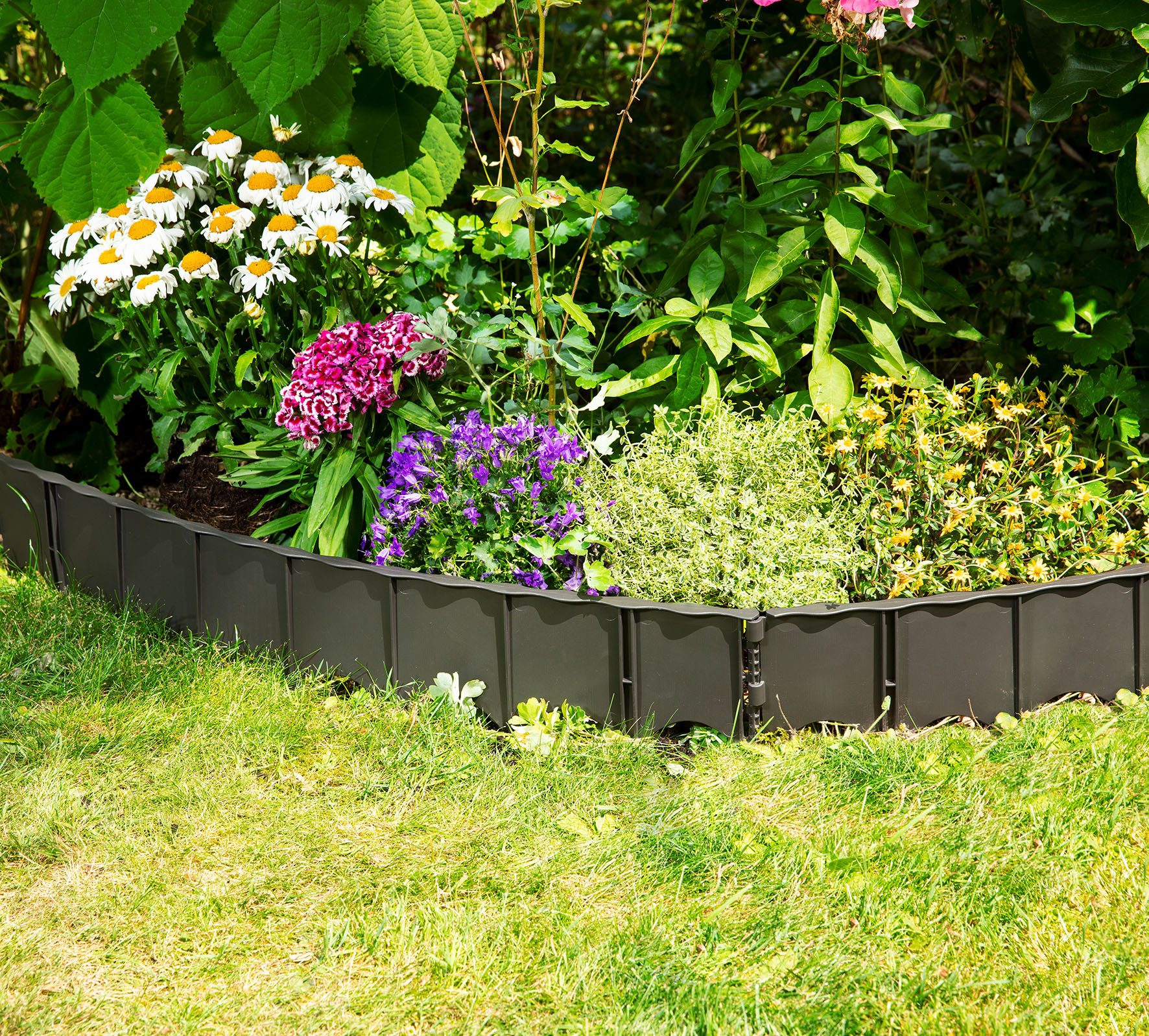 Garantia EDGAR Rasenkante - die elegante Beetumrandung für Ihren Garten. Die Beetumrandung in moderner Farbgebung ist höchstflexibel, UV- und witterungsbeständig und dient dazu Rasen, Beete und Wege in Ihrem Garten elegant voneinander zu trennen. Die Einzelelemente können längs und quer ineinander gesteckt werden. Das Stecksystem einfach mit dem Gummihammer einhämmern. Die EDGAR Rasenkante bietet Ihnen zudem flexible Anwendungsmöglichkeiten, die Verlegung ist in flexiblen Formen möglich. Bereits bei der Entwicklung eines GARANTIA Produkts wird sehr viel Wert auf ein nachhaltiges Produktdesign gelegt. Die EDGAR Rasenkante wird aus Recyclingkunststoff hergestellt und ist zu 100 % recycelbar. Ein Set besteht aus sechs Einzelelementen á 75 x 13 cm (L x H), dies ergibt somit eine Gesamtlänge von 4,5 m je Set. Qualität Made in Germany. 100 % recycelbar.