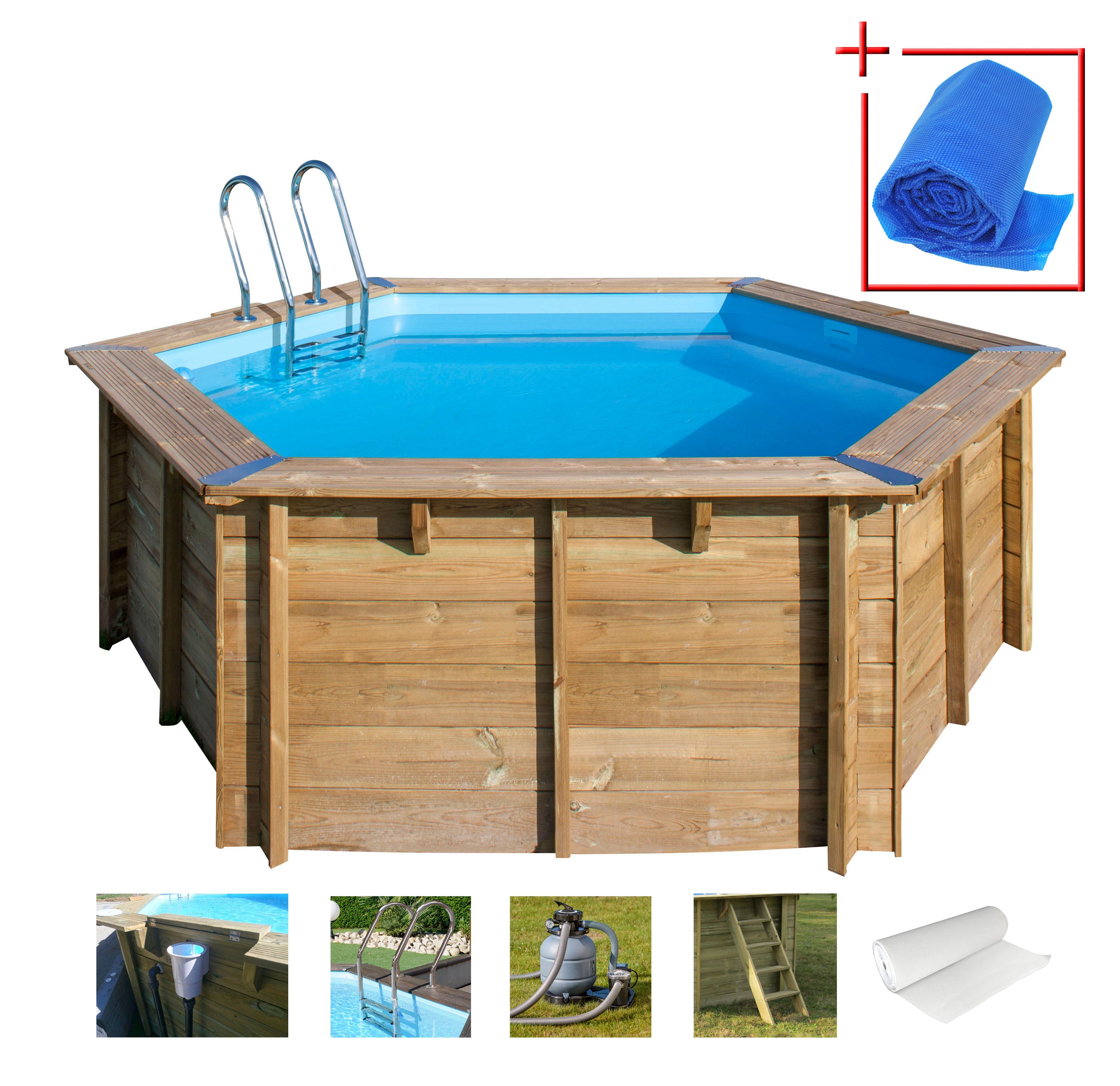 Die stabile Holzstruktur wird auf der Innenseite mit einer optimal vorgeformten blauen PVC-Innenhülle, welche durch ihre Anti-UV-Behandlung und der hohen Materialstärke äußerst langlebig ist, ausgekleidet. Eine Echtholzaußentreppe und eine Innenleiter aus Edelstahl ergänzen das ästhetische Erscheinungsbild und lassen sich auf Wunsch einfach abnehmen. Vervollständigt wird der umfangreiche Lieferumfang, je nach Modell, durch eine passende Kartuschen- oder Sandfilteranlage inklusive des benötigten Filtermediums, eine kraftvolle Pumpe, ein Skimmerset, ein Boden- und Wandschutzvlies und falls erforderlich ein zusätzliches Befestigungssystem.