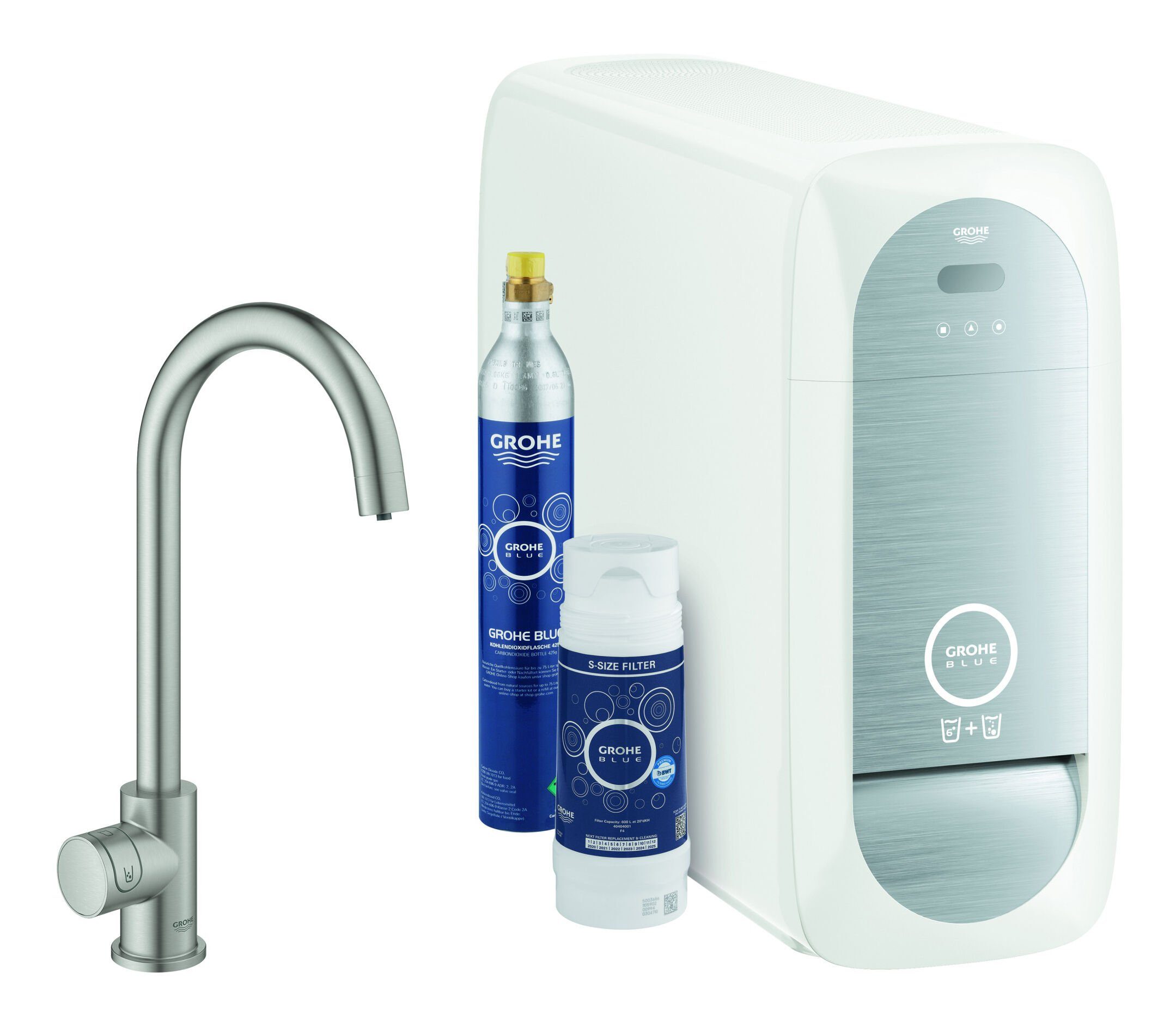 Lieferumfang | Flexible Anschlussschläuche GROHE Blue Home Kühler GROHE Blue Filter S-Size, Filterkopf mit flexibler Wasserhärteeinstellung GROHE Blue 425 g CO2-Flasche |