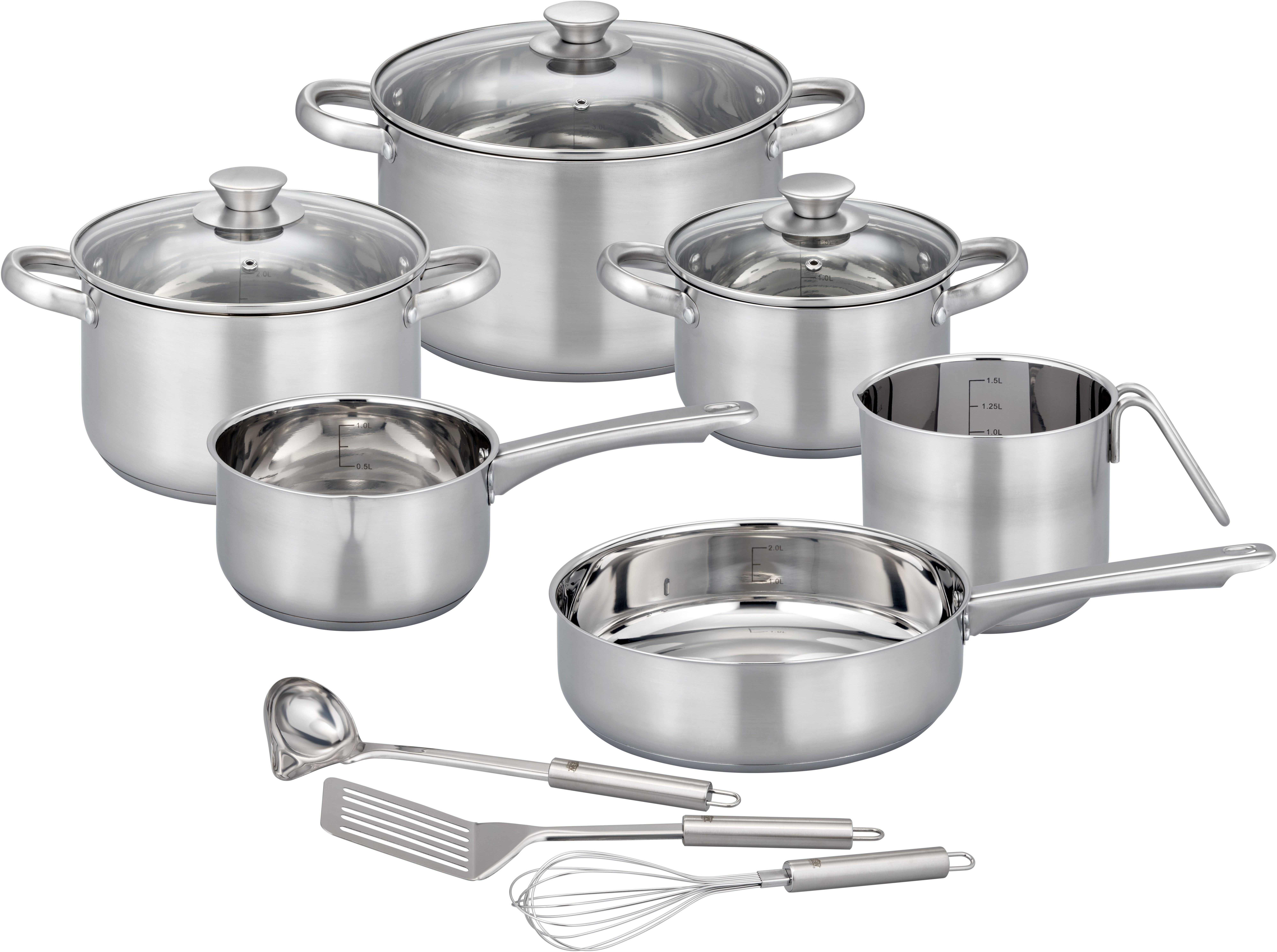 Lieferumfang | Bratpfanne ø 24 x H 7,0 cm, Inhalt ca. 2,8 L Kochtopf mit Glasdeckel ø 16 x H 9,5 cm, Inhalt ca. 1,8 L Kochtopf mit Glasdeckel ø 20 x H 11,5 cm, Inhalt ca. 3,5 L Kochtopf mit Glasdeckel ø 24 x H 13,5 cm, Inhalt ca. 6,0 L Milchtopf mit Ausguss ø 14 x H 12,0 cm, Inhalt ca. 1,8 L Pfannenwender Schneebesen Soßenlöffel Stielkasserolle mit Ausguss ø 16 x H 8,5 cm, Inhalt ca. 1,6 L |