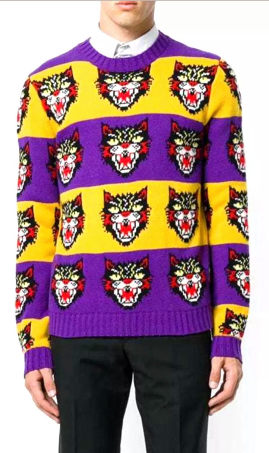 Dieser Gucci Pullover ist ein echter Hingucker und bringt das ikonische „Angry Cat“ Tiger-Motiv in einem einzigartigen, mehrfarbigen Jacquard-Strickmuster. Der Pullover ist Teil der AW-Kollektion von Gucci und wurde von Alessandro Micheles Liebe zur Natur inspiriert. Gefertigt aus reiner, hochwertiger Wolle, bietet dieser Pullover ein angenehmes Tragegefühl und höchsten Komfort.