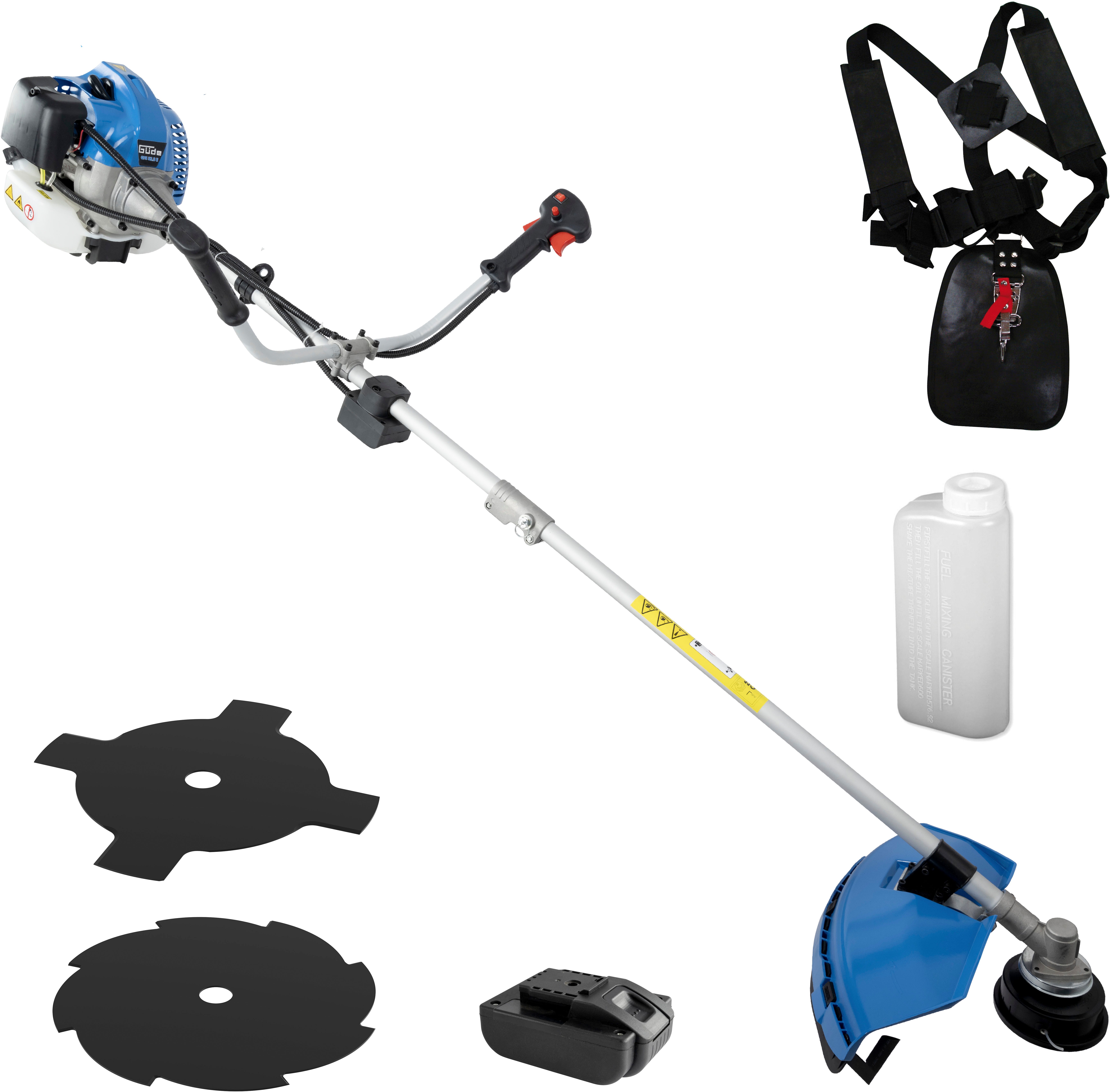 Lieferumfang | Wirbelblatt, Sternblatt, Fadenspule, Ölflasche, Tragegurtsystem, Akkupack, Ladegerät, Bedienungsanleitung |