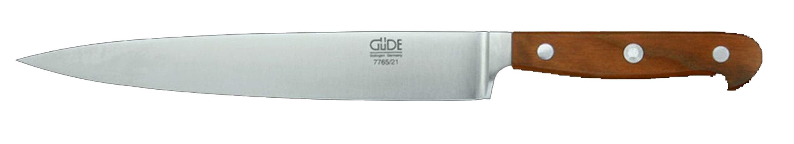Hochwertige Messer müssen nicht nur scharf sein, sie müssen scharf bleiben, sie sollen gut in der Hand liegen und ausbalanciert sein, damit ermüdungsfreies und jederzeit sicheres Arbeiten garantiert ist. Die optimale Schärfe und Schneidhaltigkeit der Serie Franz GÜDE wird sowohl durch die Härte des GÜDE Klingenstahls mit ca. 57-58 HRc (Rockwell) als auch durch den GÜDE Watenwinkel von ca. 33 Grad sichergestellt. Die Griff-Form, der elegante schmale Kropf und der durchgehende Erl machen aus den Messern der Serie Franz GÜDE ein Werkzeug, das perfekte Handhabung und Ausbalancierung garantiert.