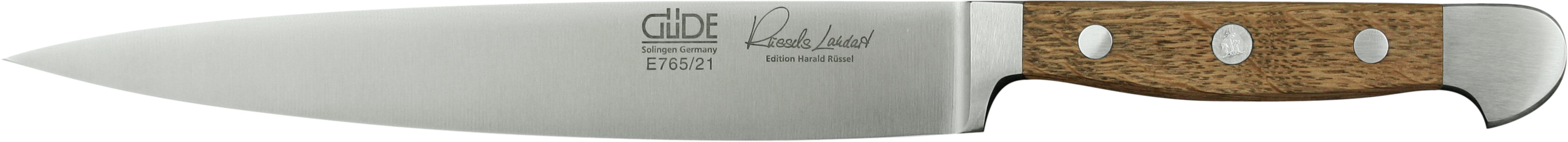 Ein gutes Messer sollte nicht nur scharf sein, es sollte auch möglichst lange scharf bleiben. Ein gutes Messer soll darüber hinaus gut in der Hand liegen und ausbalanciert sein, so dass ermüdungsfreies und jederzeit sicheres Arbeiten garantiert ist. Schärfe und Schneidhaltigkeit der Serie Alpha Fasseiche werden sowohl durch die optimale Härte des GÜDE Klingenstahls mit ca. 57-58 HRc (Rockwell) wie auch durch den GÜDE Watenwinkel von ca. 33 Grad sichergestellt. Die Form des Griffes, der Voll-Erl und der für GÜDE typische Doppelkropf machen aus den Messern der Serie Alpha Fasseiche ein zuverlässiges Werkzeug, das perfekte Handhabung und Ausbalancierung garantiert.