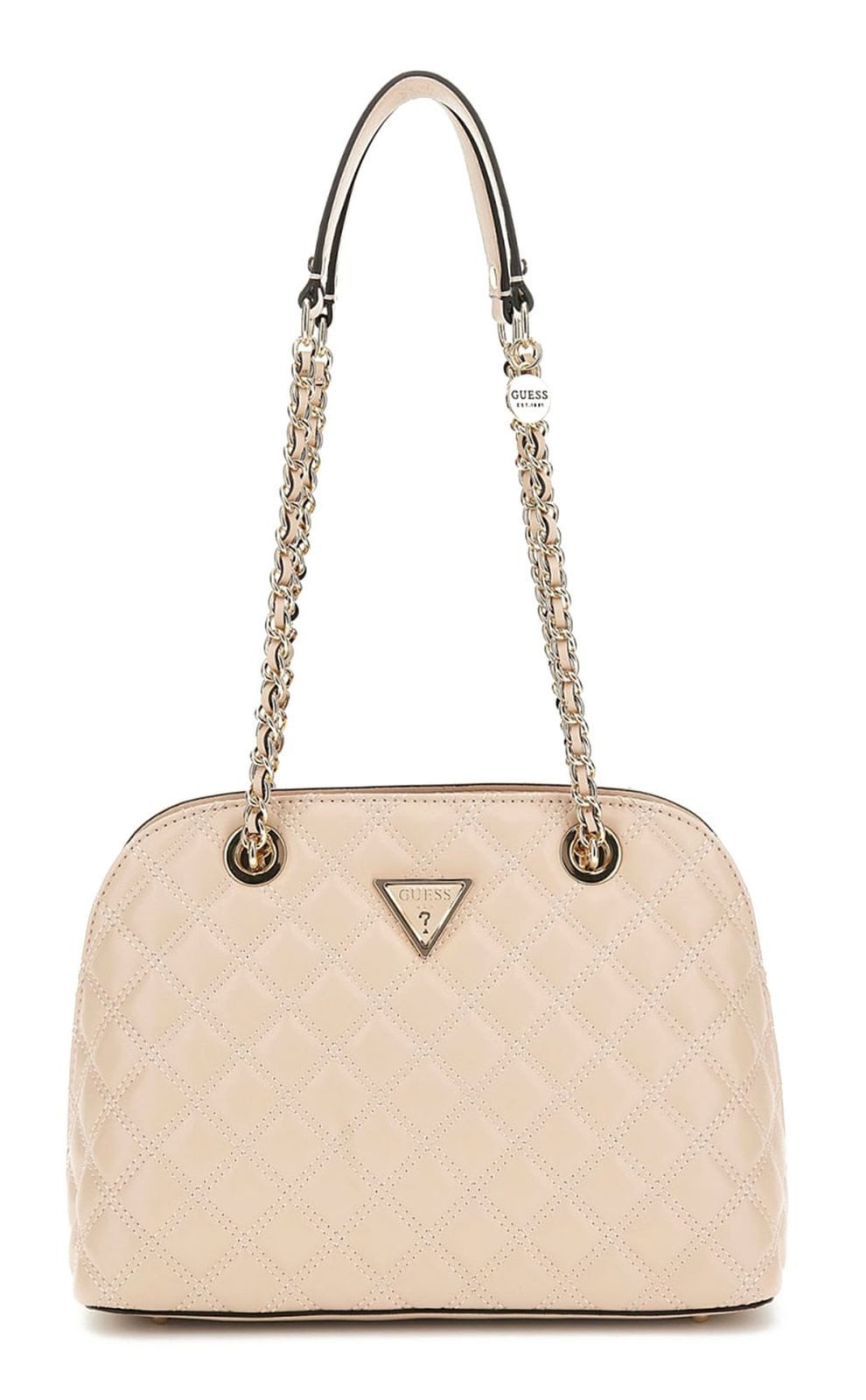 Diese GUESS Giully Dome Satchel Schultertasche ist ein echtes Highlight. Das schicke Design ist zu jedem Look das perfekte Accessoire und wird viele neidische Blicke auf sich ziehen. Getoppt wird das Ganze mit edlen Akzenten in goldfarben. Im Inneren haben Sie genug Stauraum für all Ihre Wertgegenstände und behalten dank der weiten Öffnung den perfekten Überblick. Sie können diese GUESS Tasche bequem an den Henkeln tragen. Genießen Sie so einen angenehmen Tragekomfort über den Tag hinweg.