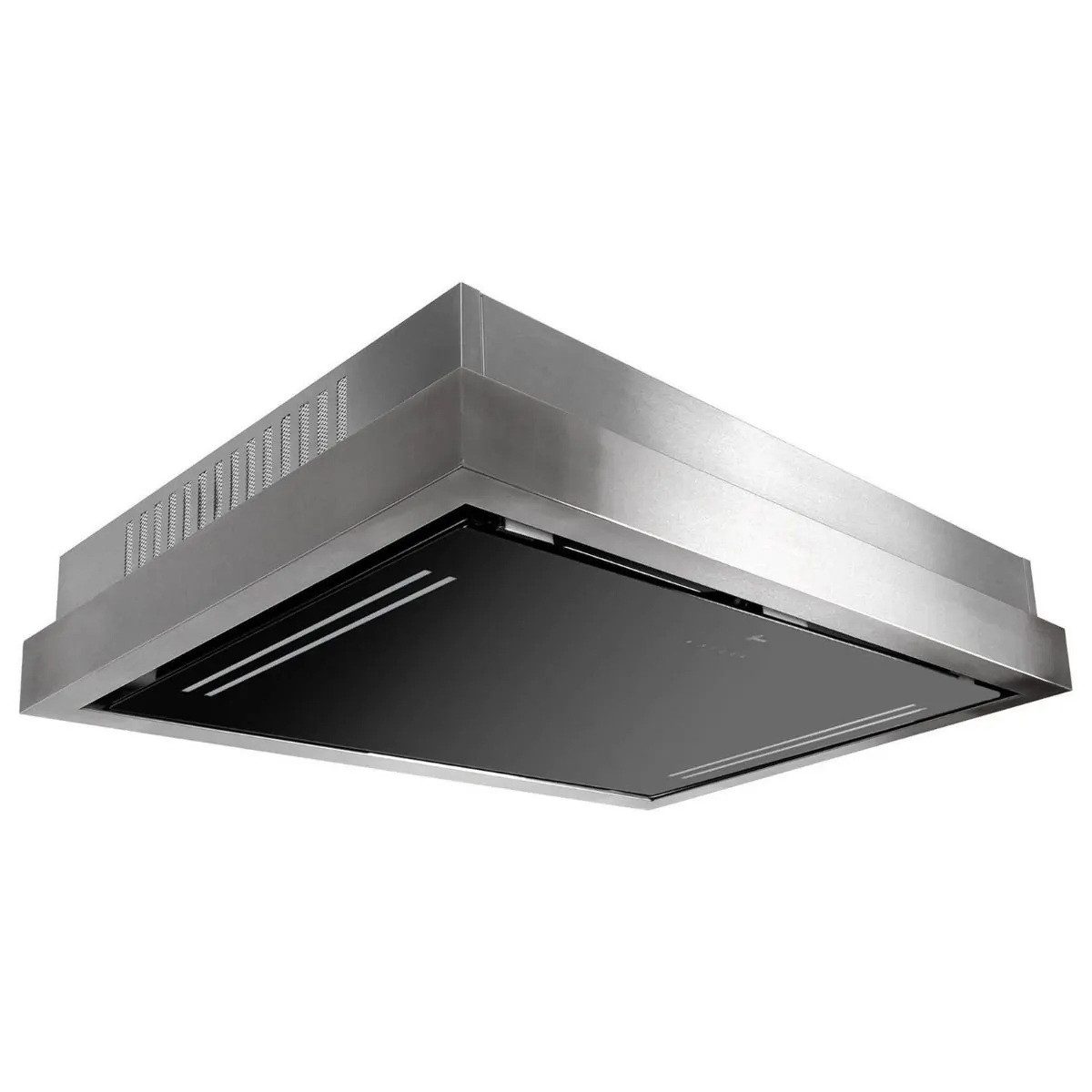 Luxus Umluft Deckenhaube mit Ionisierung in Edelstahl-Schwarzglas Ausführung.