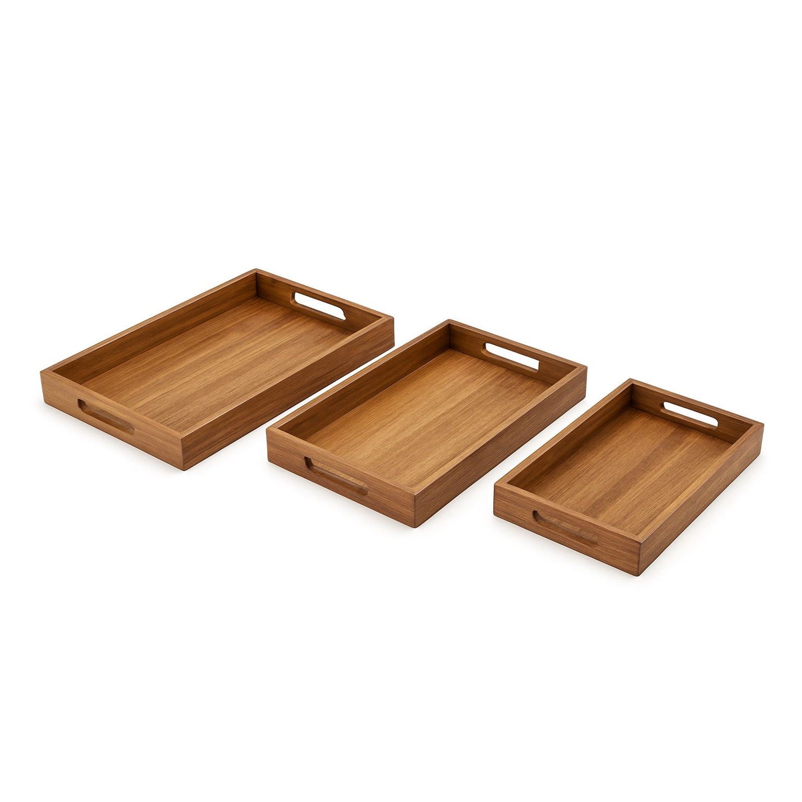 Entdecken Sie dieses stilvolles 3er Set eckige Servierset aus hochwertigem Akazienholz. Drei verschiedene Größen ermöglichen flexible Einsatzmöglichkeiten – ineinander stapelbar und mit praktischen Tragegriffen versehen. Robustes Akazienholz mit eleganter Maserung sorgt für einen stabilen Halt und einen stilvollen Auftritt. Das schlichte, zeitlose Design passt auf jeden gedeckten Tisch und macht die Tabletts zu einem echten Hingucker. Die Griffmulden sind besonders griffig konstruiert, sodass Sie auch voll beladen alles sicher transportieren und anschließend wieder abstellen können. Das Dreier-Set lässt sich beliebig kombinieren oder einzeln verwenden, sodass Sie jederzeit flexibel bleiben. Die drei Größen – Groß 40 x 30 x 4,5 cm, Mittel 35 x 25 x 4,5 cm und Klein 30 x 20 x 4,5 cm – ermöglichen vielfältige Einsatzmöglichkeiten: Frühstückstablett fürs Bett, Getränketablett, Teetablett, Snacktablett für gemütliche Picknicks oder schlicht als dekoratives Deko-Tablett. Die Servierplatten sind ineinander stapelbar und spart so Platz, wenn es nicht in Gebrauch ist. Zur Reinigung genügt ein feuchtes Abwischen, anschließend das Tablett aufrechtstehend trocknen lassen.