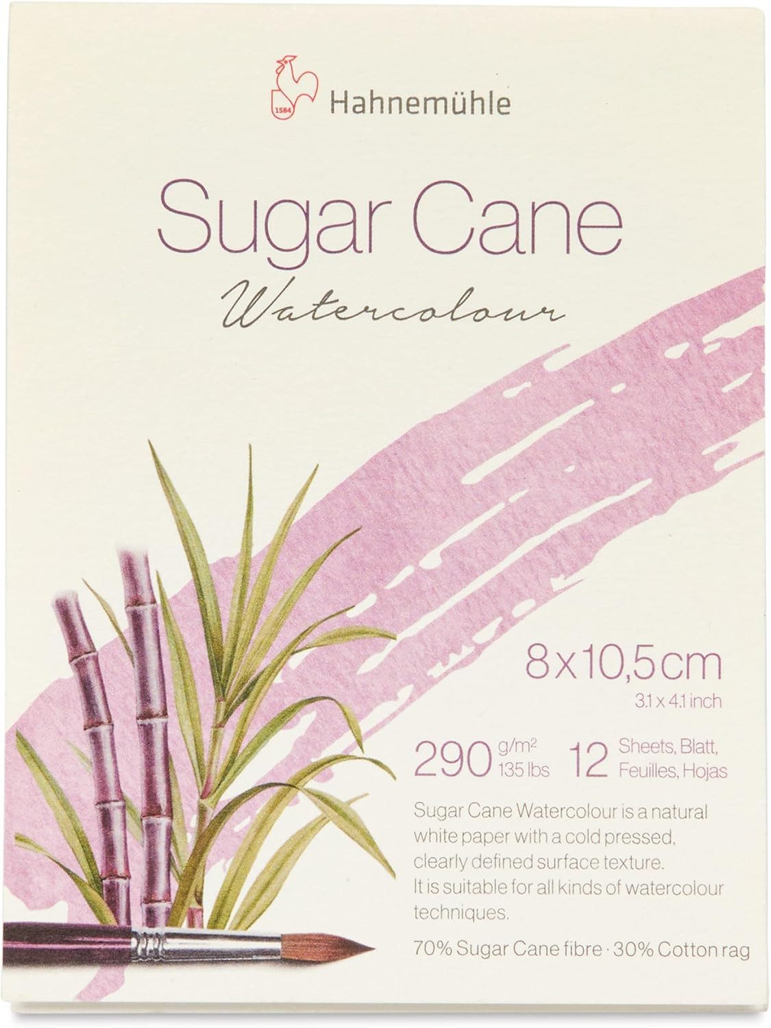 Hahnemühle Sugar Cane Watercolour, Aquarellpapier aus Zuckerrohr, 290 g/m², naturweiß, 12 Blatt (8 x 10,5 cm) Das Hahnemühle Sugar Cane Aquarellpapier ist die neueste Ergänzung in der Hahnemühle Natural Line. Das 290 g/m² starke Papier besteht zu 70 % aus schnell nachwachsenden Zuckerrohrfasern, der so genannten Bagasse, einem Nebenprodukt bei der Zuckergewinnung. Mit 70% Sugar Cane und 30% Baumwolle kombiniert das naturweiße, warmtonige Aquarellpapier die Festigkeit der Zuckerrohrfasern und die Weichheit der Baumwolle. Auch diese Fasern sind pflanzliche Reststoffe aus der Textilindustrie. Das Papier mit seiner matten, ausgeprägten Oberflächenstruktur hat eine wunderschöne samtige Haptik. Es lässt sich mit Aquarell, Gouache und allen Nass-in-Nass Techniken hervorragend bearbeiten. Farben leuchten brillant und samtig. Die natürlichen Fasern des Zuckerrohrs verleihen dem Papier eine hohe Stabilität und Reißfestigkeit, so dass das Papier große Mengen an Wasser und Farben aufnehmen kann, ohne dass sich die Fasern aufstellen, oder das Papier stark wellt. Farben lassen sich auf der Oberfläche leicht anlösen und neu lasieren. Farbverläufe und Effekte, etwa durch Salz- oder Wassertropfen, aber auch dünne Linien und Akzente mit Fineliner meistert das Papier gekonnt.