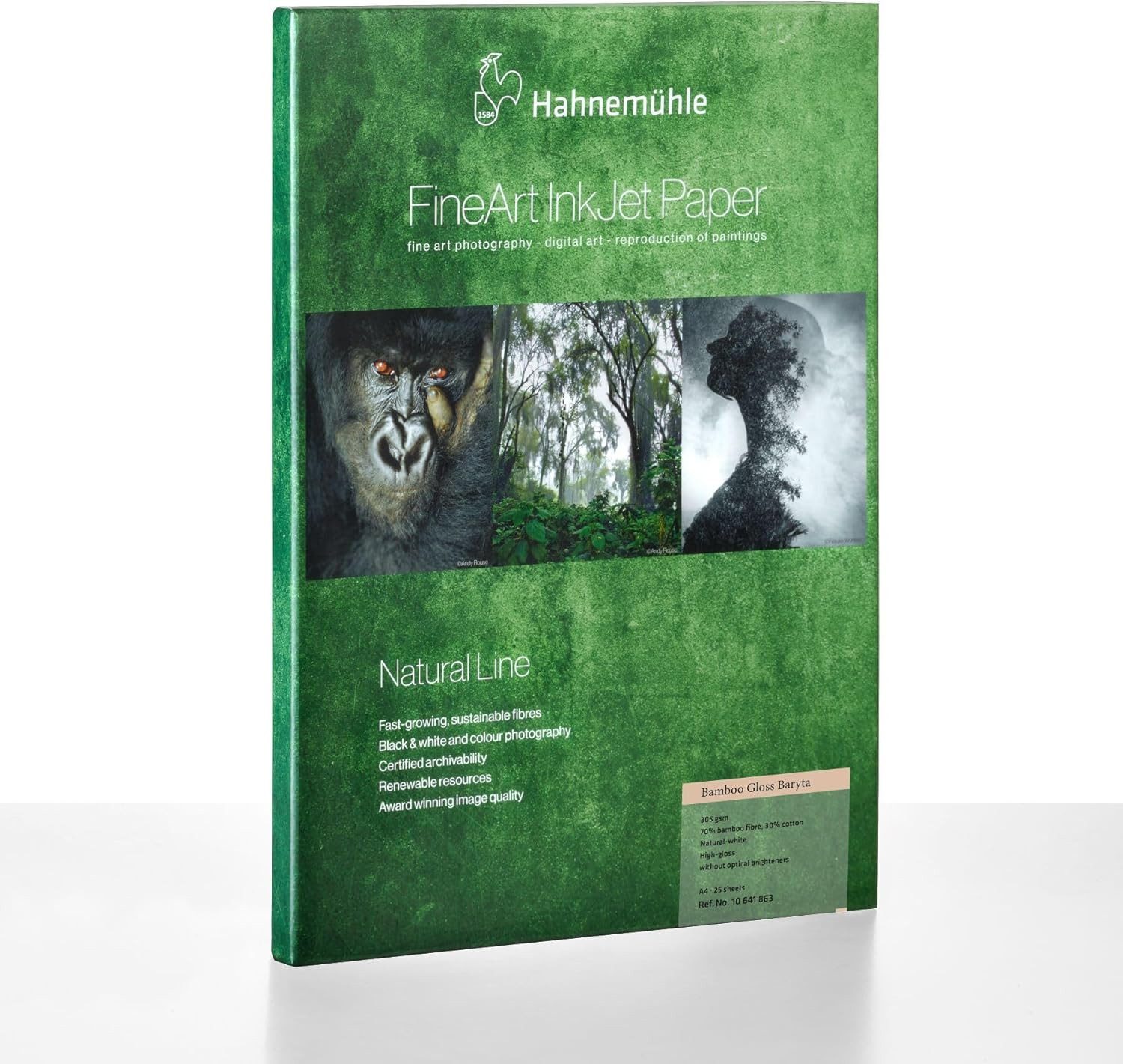 Hahnemühle Bamboo Gloss Baryta, nachhaltiges Inkjet-Fotopapier mit 90% Bambusfastern, naturweiß, 305 g/m² (210 x 297 mm) Hahnemühle Bamboo Gloss Baryta setzt neue Maßstäbe als weltweit erstes FineArt Inkjet Papier, das zu 90% aus Bambusfasern besteht und mit einer hochwertigen, hochglänzenden Baryt-Inkjet-Beschichtung versehen ist. Das naturweiße Papier ist in einem angenehmen, warmen Ton gehalten und enthält keine optischen Aufheller. In Kombination mit seiner leicht strukturierten Oberfläche bietet Hahnemühle Bamboo Gloss Baryta eine natürlich wirkende Ästhetik mit dem Aussehen und der Haptik eines analogen Baryta Papiers. Die hochglänzende Premium-Inkjet-Beschichtung liefert hervorragende Druckergebnisse mit definierter Farb- und Detailwiedergabe, tiefen Schwarztönen und starken Kontrasten. Das zusätzlich enthaltene Bariumsulfat in der Beschichtung verbessert den Tonwertumfang, die Schärfe und die Klarheit der Drucke. Hahnemühle Bamboo Gloss Baryta ist säure- und ligninfrei und erfüllt die höchsten Anforderungen an die Alterungsbeständigkeit.