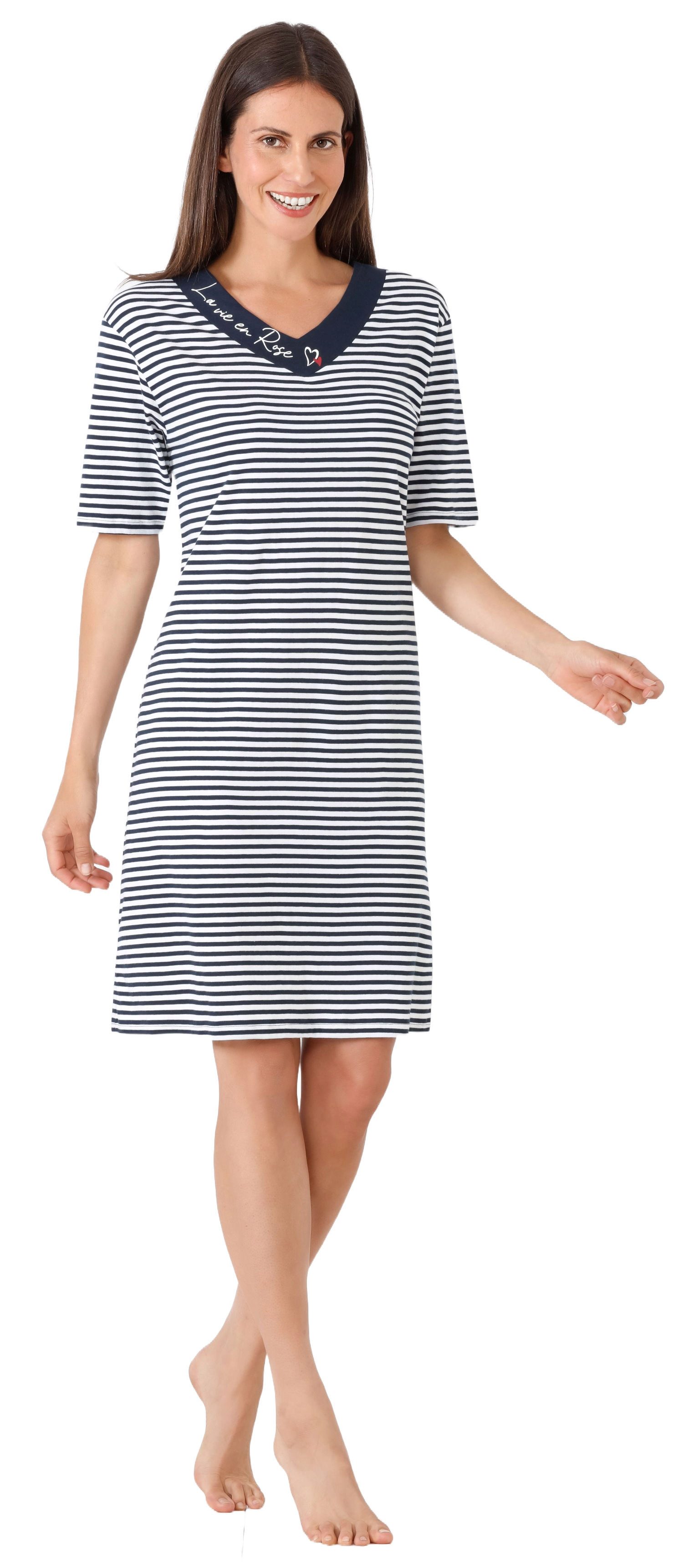 Dieses sportliche Hajo Damen Nachthemd vereint zeitlosen Stil mit außergewöhnlichem Tragekomfort. Der schmeichelhafte V-Ausschnitt setzt dezent Akzente und verleiht dem Kleidungsstück eine feminine Note, während die kurzen Ärmel für eine angenehme Luftzirkulation sorgen und so auch an warmen Nächten für ein behagliches Tragegefühl sorgen. Hergestellt aus 100 % reiner Baumwolle, schmiegt sich das Material sanft an die Haut, bietet hervorragende Atmungsaktivität und garantiert ein natürliches, weiches Gefühl, das zu erholsamen Nächten einlädt. Mit einer Довжина von 95 cm fällt das Nachthemd in einer schmeichelhaften Silhouette und bietet gleichzeitig ausreichend Bedeckung, sodass es sich ideal als stilvolles Schlafshirt oder für entspannte Stunden zuhause eignet. Die hochwertige Verarbeitung und das zeitlose Design machen dieses Nachthemd zu einem unverzichtbaren Begleiter für jede Frau, die Wert auf Komfort, Qualität und schlichte Eleganz legt. Genießen Sie den luxuriösen Komfort und die natürliche Leichtigkeit dieses exquisiten Nachtgewands – Ihr perfekter Partner für erholsamen Schlaf und gemütliche Abende.