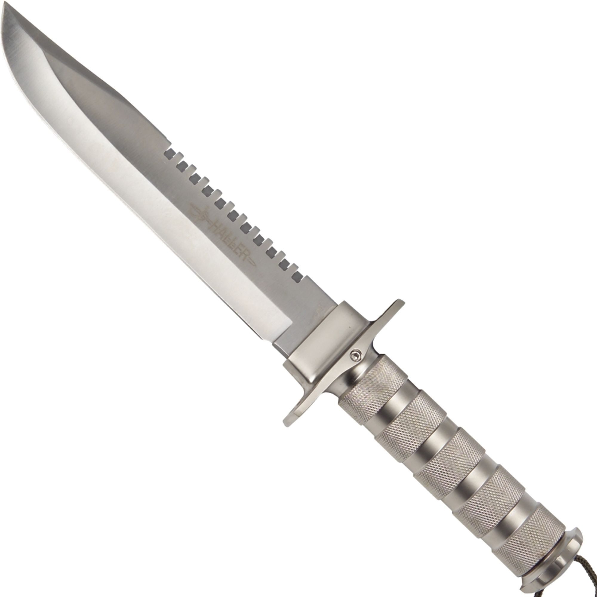 Haller Überlebensmesser mit Klinge aus 420 rostfreiem Stahl, der Griff aus Metall. Im Endknauf des Griffes ist ein Kompass, im Hohlgriff befinden sich verschiedene Survival-Utensilien. Mit Messerscheide.