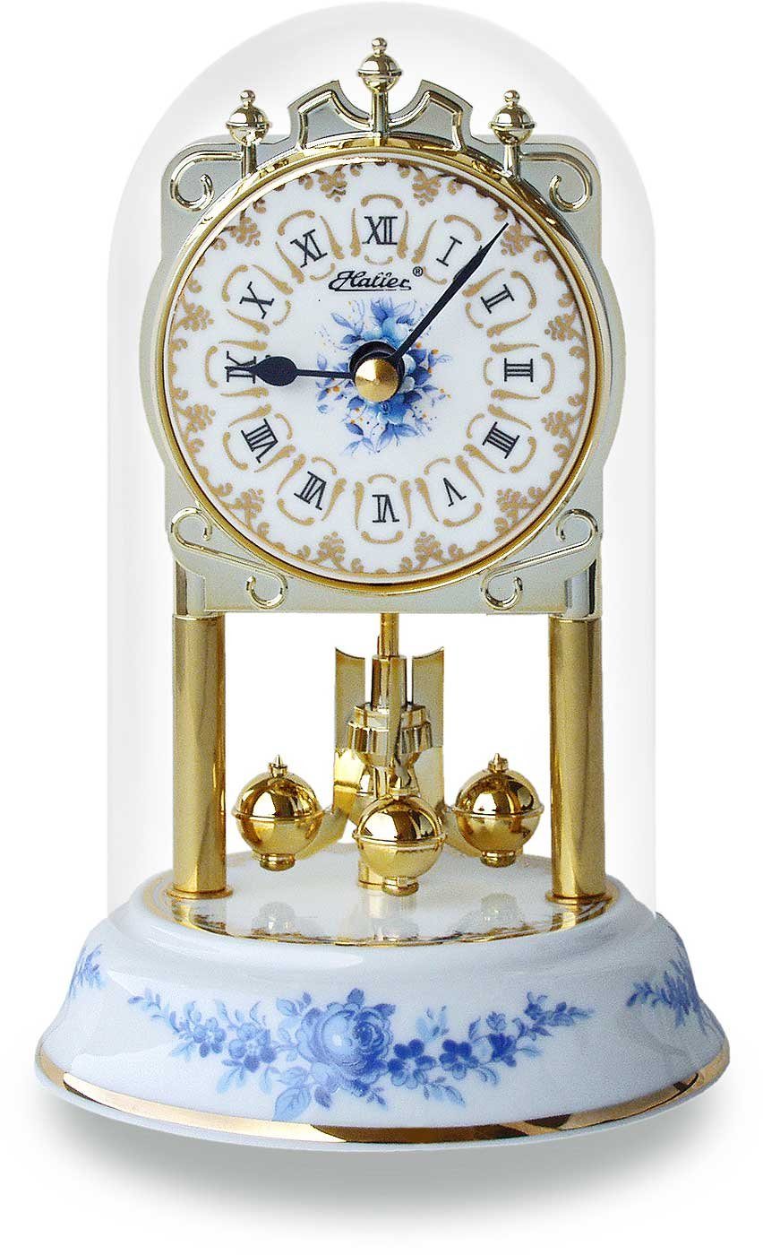 Das weiße Porzellanzifferblatt ist mit einer zarten Rosenverzierung geschmückt und trägt elegante, dunkelblaue römische Zahlen – ideal für ein romantisches oder klassisches Wohnambiente. Der goldfarbene Drehpendel ergänzt das nostalgische Gesamtbild und sorgt für eine sanfte Bewegung im unteren Bereich. Durch das zuverlässige Quarzwerk bleibt die Uhr angenehm leise und bietet gleichzeitig höchste Präzision.
