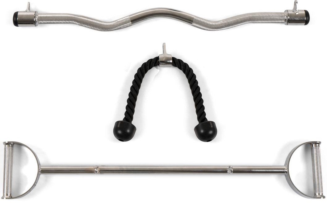 Das Trizeps-Seil ist speziell für gezieltes Armtraining konzipiert und hilft dabei, deine Trizepsmuskulatur zu stärken. Die SZ-Stange ermöglicht ein komfortables Bizepstraining und sorgt für eine optimale Haltung während der Übungen. Die Latzugstange erlaubt verschiedene Rückenübungen, um deine Rückenmuskulatur zu stärken und deinen Oberkörper zu formen.