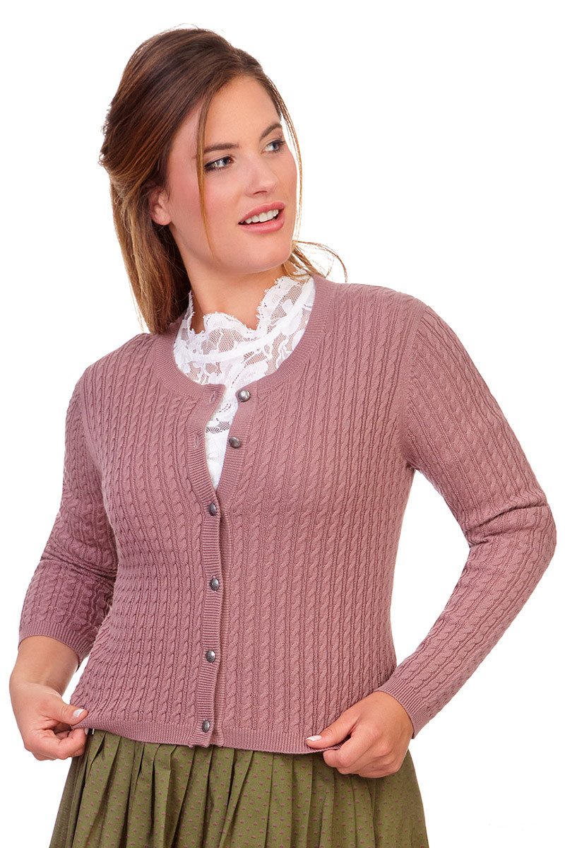 Die vielseitige, verträumte Trachten Strickjacke Reit für Damen von der Trachtenmarke Hammerschmid ist leicht tailliert geschnitten und hat allover ein zartes Zopfstrick-Muster. Als dezenter Kontrast dient ein Rippenstrick-Muster am Rundhals-Ausschnitt, an den Bündchen und am Bund. Liebliche Metallknöpfe in Altsilber mit feinem Muster zieren die Knopfleiste. Der hohe Baumwoll-Anteil garantiert einen tollen Tragekomfort sowie eine weiche Qualität. Diese herrliche Kreation lässt sich klassisch zum Dirndl kombinieren, passt aber auch super zur Trachtenjeans und Lederhose. Bitte beachten Sie die Übergrößenzuschläge ab Розмір 48.