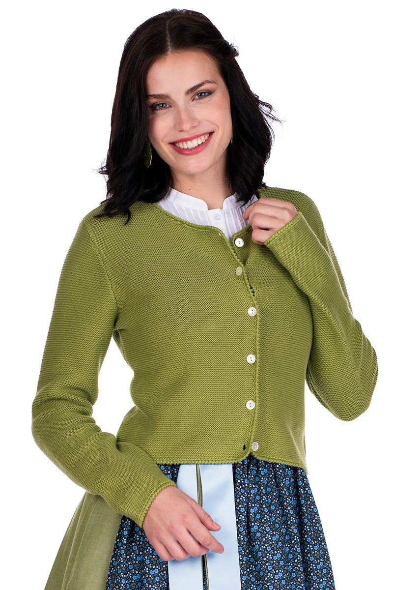 Die entzückende, kurze Damen Trachten Strickjacke "Spiez" in Beerenrosa bzw. Farn besteht aus feiner, angenehmer Baumwolle, ist leicht tailliert geschnitten, hat ein klassisches Strickmuster in Linksstrick-Optik, einen Rundhals-Ausschnitt sowie eine Knopfleiste mit herrlich schillernden, echten Perlmuttknöpfen. Sowohl der Ausschnitt und die Knopfleiste als auch der Saum und die Bündchen sind im Kordel-Look hübsch abgesetzt. Die Strickjacke für Damen lässt sich fantastisch zum Dirndl und zur Lederhose kombinieren. Bitte beachten Sie ab Розмір 48 die Größenzuschläge.