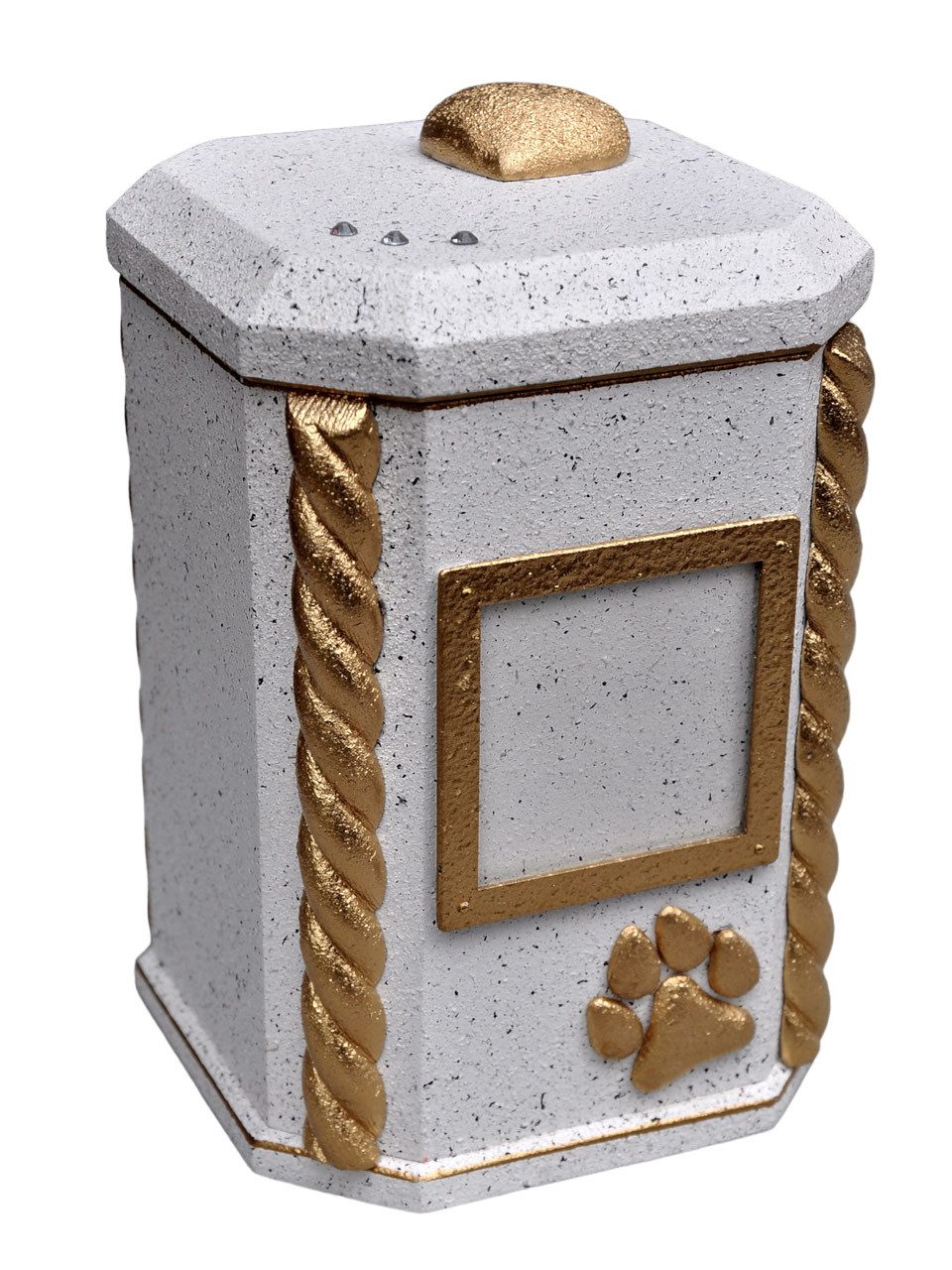 Wenn ein geliebtes Wesen gehen muss, egal ob Mensch oder Tier, dann ist das sehr schmerzhaft. Es ist nicht nur selbstverständlich, unseren Lieben ein würdevolles gehen zu ermöglichen, sondern auch eine würdevolle Bestattung. Die Tierurne wird komplett von Hand gefertigt. Oben ziert ein Herz in Goldfarben. Die Vorderseite ziert ein Bilderrahmen aus Acrylglas. Vorne eine goldene Pfote. Dazu schmücken die Urne vorne 2 Gerlanden in Goldfarben. Ein Schmuckstück für Ihr Zuhause und ein schönes Andenken an Ihren treuen Gefährten. Diese Urne ist ausschließlich für den Innenbereich geeignet. Kleine Unterschiede der Optik (zum Foto) sind möglich, da Handarbeit und Einzelanfertigung.