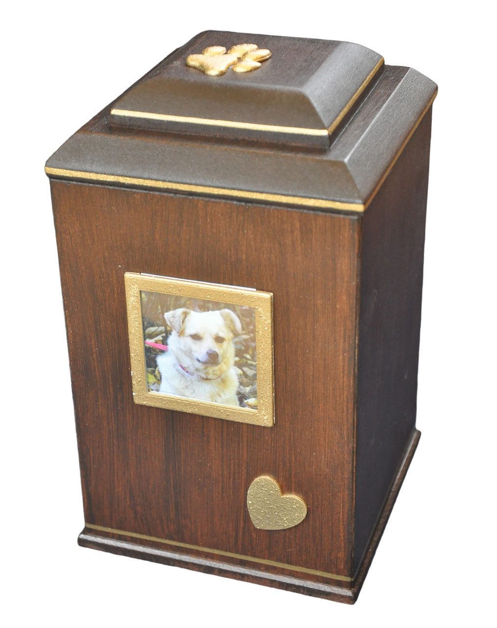 Wenn ein geliebtes Wesen gehen muss, egal ob Mensch oder Tier, dann ist das sehr schmerzhaft. Es ist nicht nur selbstverständlich, unseren Lieben ein würdevolles gehen zu ermöglichen, sondern auch eine würdevolle Bestattung. Die Tierurne wird komplett von Hand gefertigt. Oben ziert eine Pfote in Goldfarben. Die Vorderseite ziert ein Bilderrahmen aus Acrylglas. Ein Schmuckstück für Ihr Zuhause und ein schönes Andenken an Ihren treuen Gefährten. Diese Urne ist ausschließlich für den Innenbereich geeignet. Kleine Unterschiede der Optik (zum Foto) sind möglich, da Handarbeit und Einzelanfertigung.