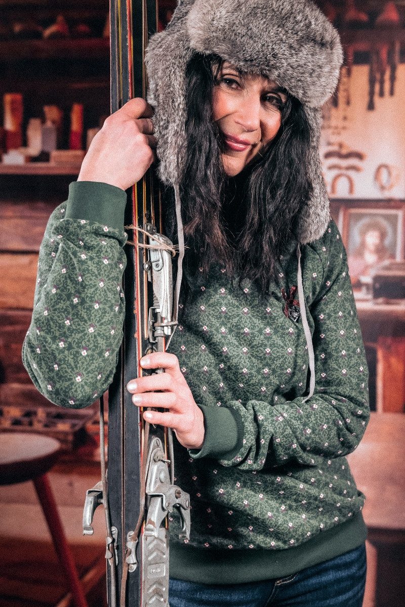 Zenzi, das bezaubernde Damen Sweatshirt aus dem Hause Hangowear, wird mit viel angenehmer Baumwolle gefertigt, ist lässig geschnitten und innen kuschelweich angerauht. Der Rundhals-Ausschnitt, der gerade Saum und die breiten Bündchen sind unifarben sowie gerippt und die Ärmel im Raglan-Stil vernäht. Vorder-, Rückseite und Ärmel sind allover wundervoll mit floralen Ornamenten in hellerem Grün bedruckt und mit niedlichen Blümchen in Weiß/Rot/Brombeer akzentuiert. Komplett wird der herrliche Sweatpullover für Damen durch das süße Satin-Schleifchen in Brombeer mit dem silbernen Herz-Edelweiß-Anhänger und den kleinen Marken-Print in Brombeer rückseitig links über dem Saum. Der hübsche Damenpullover lässt sich toll zu Trachtenjeans und Lederhose kombinieren.