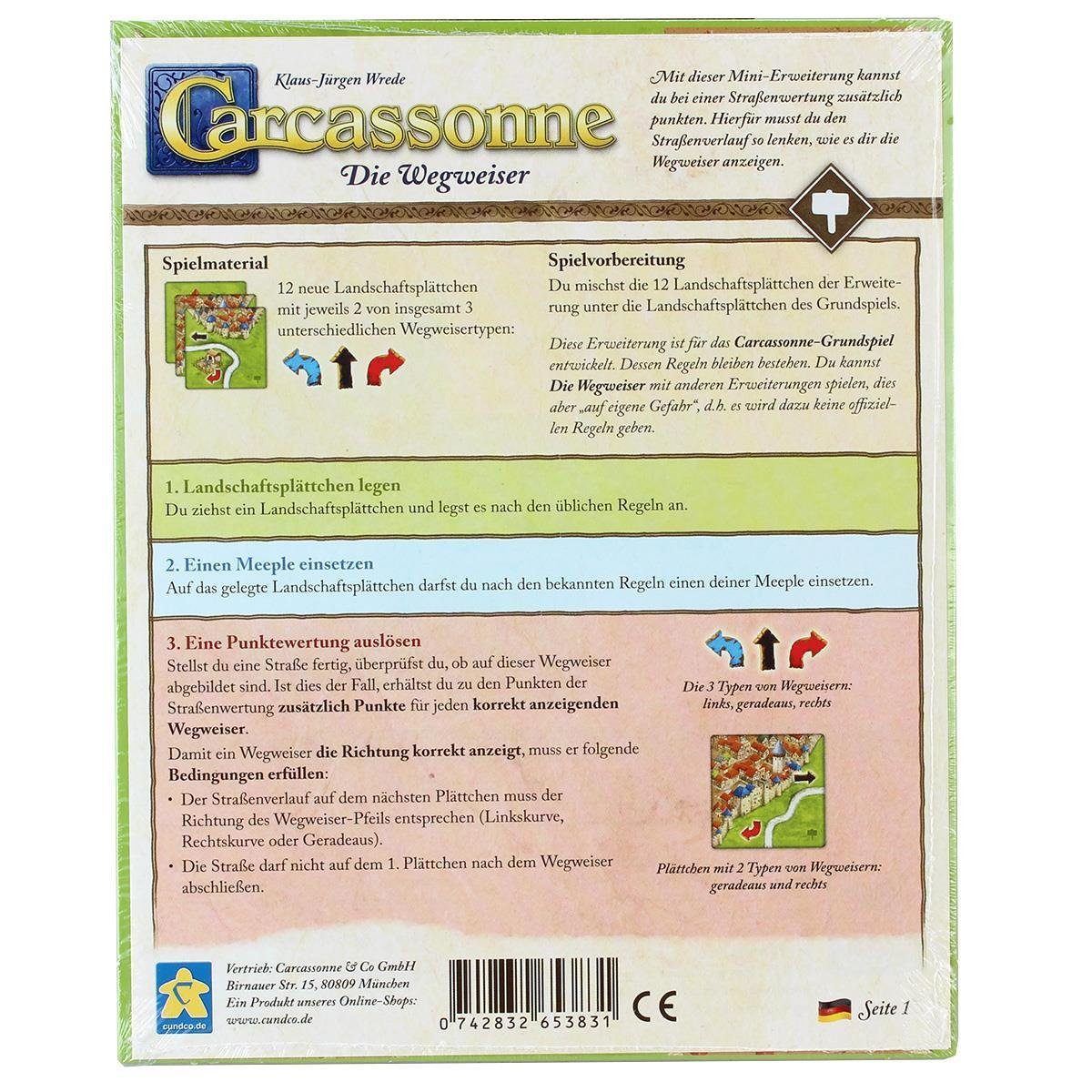 Bitte beachtet: Diese Erweiterung ist für das Carcassonne-Grundspiel entwickelt. Dessen Regeln bleiben bestehen. Du kannst Die Wegweiser mit anderen Erweiterungen spielen, dies aber „auf eigene Gefahr“, d.h. es wird dazu keine offiziellen Regeln geben.