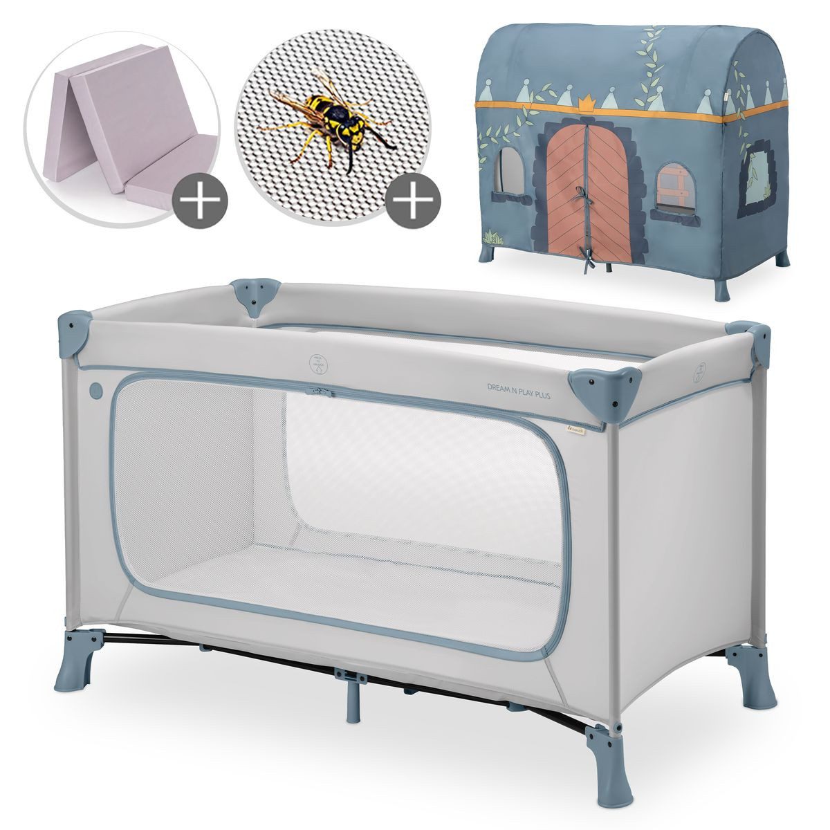 Lieferumfang | Hauck Reisebett Dream'n Play Plus - Dusty Blue Hauck Faltmatratze (2 cm) Hauck Transporttasche für Reisebett Hauck Spielzelt Travel Bed Cover - Palace Alvi Komfort Reisebettmatratze (6 cm) Alvi Transporttaschen für Matratze Zamboo Insektenschutz |