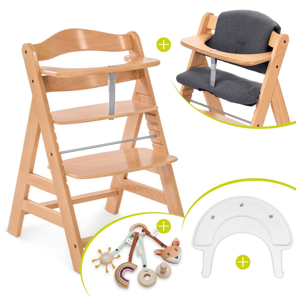 Lieferumfang | Hauck Alpha Plus Hochstuhl, Schutzbügel, Schrittgurt, 5-Punkt-Gurtsystem, Hauck Sitzverkleinerer Highchairpad Select in Jersey Charcoal, Hauck Play Tray Basis für Alpha & Beta Hochstuhl, Hauck Play Catching - Fox |