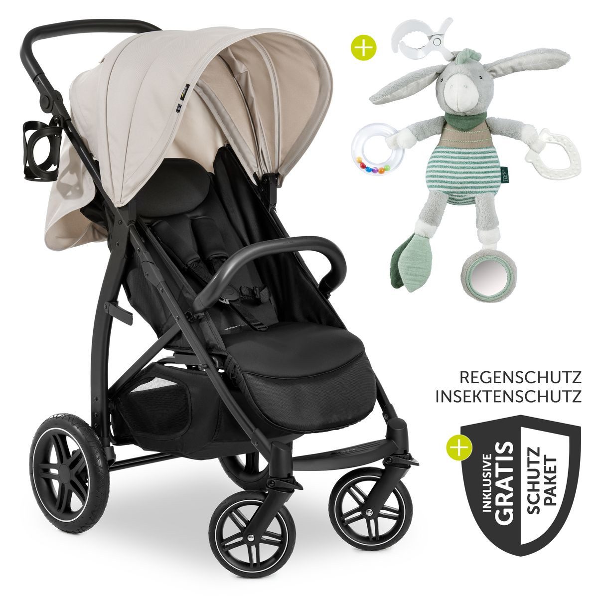 Lieferumfang | Hauck Buggy Rapid 4D - Classic Beige XL Sonnenverdeck All-Terrain Bereifung Becherhalter Schutzbügel Zamboo Universal Regenschutz Premium Zamboo Universal Insektenschutz - Grau Fehn Activity-Spieltier mit Klemme - Esel |