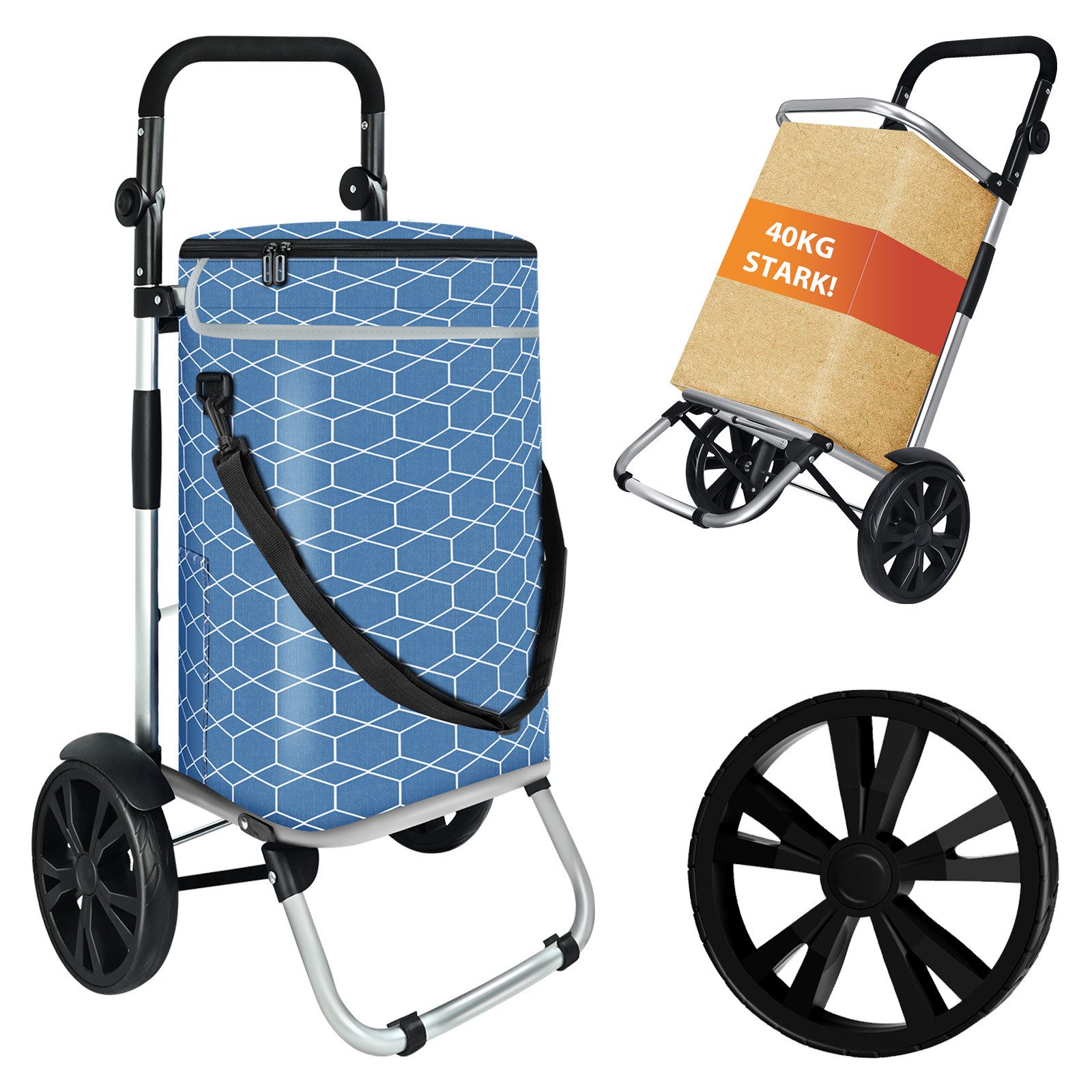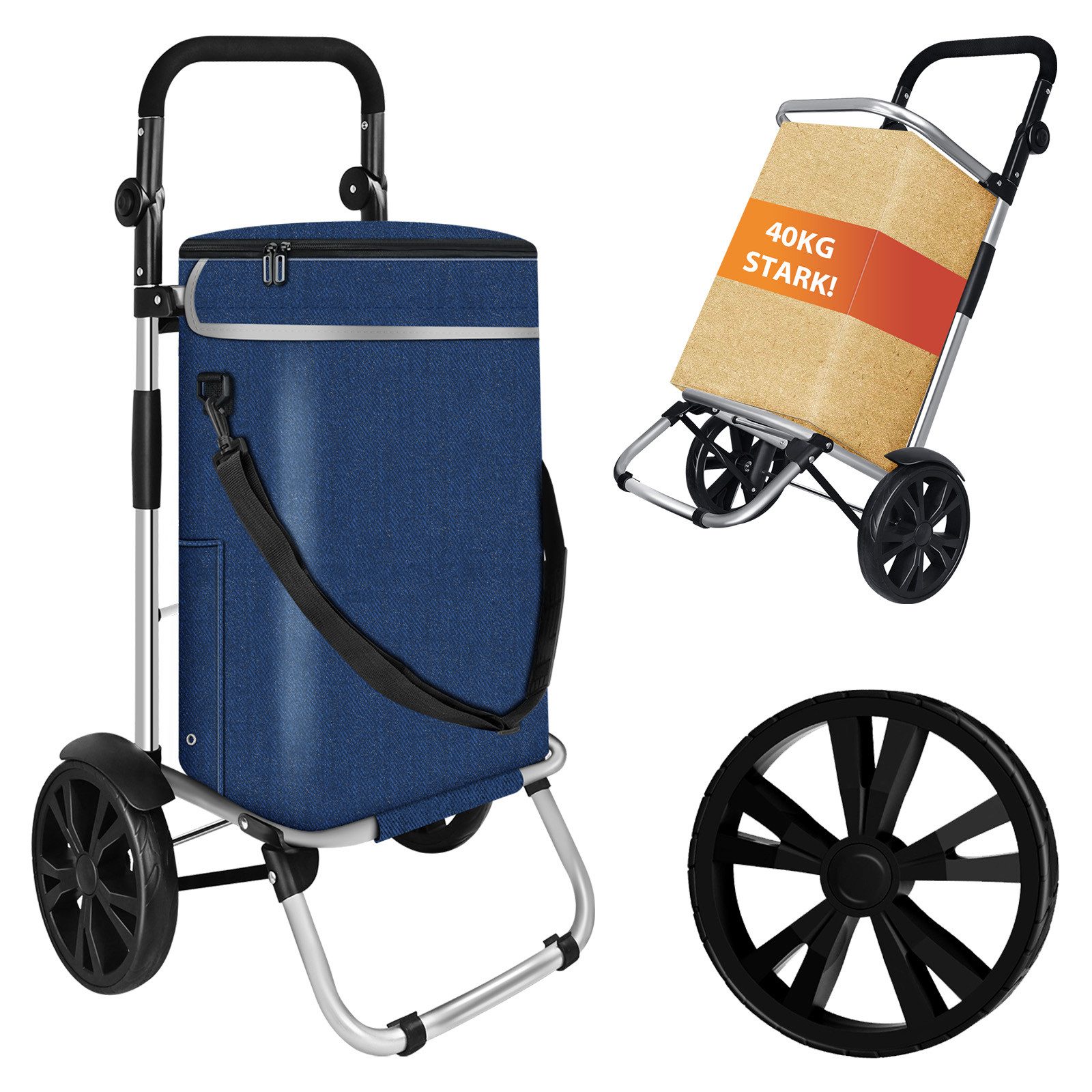 Die Kombination aus stabilem Metallrahmen und strapazierfähiger Polyesterabdeckung macht den Wagen besonders langlebig. Er hält auch schwerere Einkäufe sicher aus und bleibt selbst bei häufiger Nutzung formstabil.