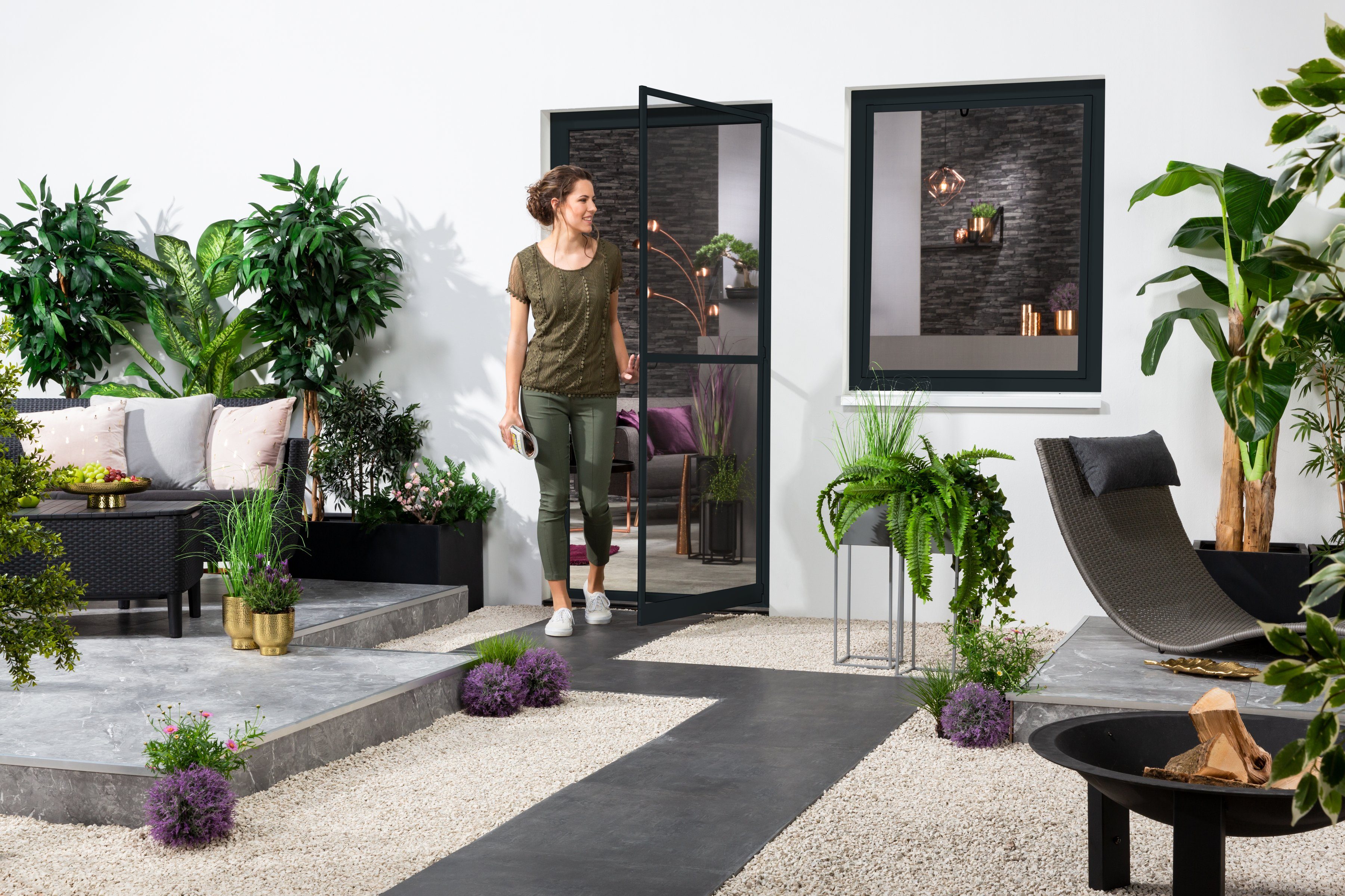 Die Fliegengitter-Tür „MASTER SLIM +“ lässt sich aufgrund ihrer geringen Einbautiefe von ca. 15 mm einfach zwischen Türrahmen und Rollo befestigen, wobei die Anschlagseite frei wählbar ist. Der Türrahmen wird aus den hochwertigen und stabilen Alu-Profilen, dem Alu-Mittelprofil mit integrierter Griffleiste und komplett ausgeformten Handgriff sowie dem robusten Aluminium-Trittschutzprofil zusammengebaut. Für die sehr hohe Stabilität sorgen die bewährten und patentierten Schraub-Eckverbindungen. Die Profile können auf das individuelle Türmaß angepasst werden. Sollten beim Zuschneiden leichtere Fehler passieren, können diese durch die patentierte Schnittkantenüberlappung überdeckt werden. Das lichte Maß bei der Türgröße 100 x 210 cm beträgt 97 x 207 cm. Die umlaufende Bürstendichtung, hochwertige Aluminium-Scharniere, der praktische Magnetverschluss, der eingebaute Türschließer, sowie die hohe Witterungsbeständigkeit durch die Verwendung erstklassiger Materialien runden das Preis-Leistungs-Kraftpaket ab. Zudem sorgt das mittels Klemmleisten im Rahmen befestigte hochwertige, schwarze FILATEC-GEWEBE für eine freie Sicht nach außen. Es ist sehr reißfest, stabil und witterungsbeständig. Der Bausatz kann unter Zuhilfenahme der geprüften Montageanleitung und des unterstützenden Montagevideos einfach selbst montiert werden. Dieses Insektenschutzprodukt ist mit dem "Blauer Engel"-Umweltzeichen zertifiziert.