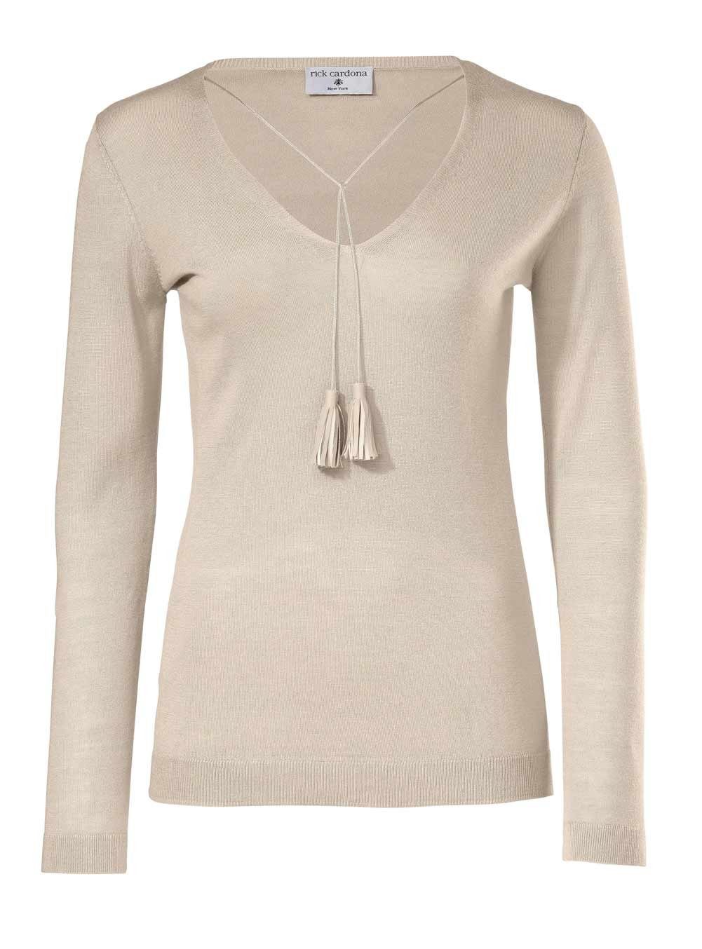 Lust auf unkomplizierten Chic? Dann ist dieser raffinierte Feinstrickpullover ein modisches Muss! Trendstarker Casual-Look mit Bändern und dekorativen Lederimitat-Quasten am V-Ausschnitt. Sportlich-legerer Schnitt mit langen Ärmeln und Rippenstrick-Abschlüssen. Довжина ca. 60 cm. Angenehm weiche Feinstrick-Qualität aus 60% Viskose/ 40% Baumwolle.