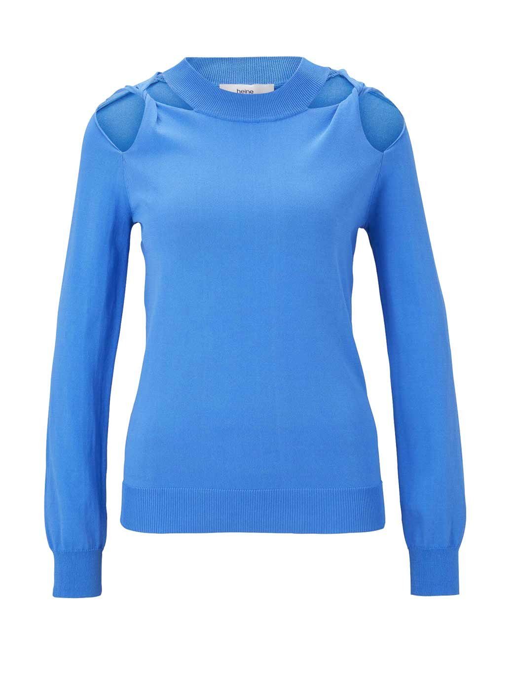 Extra heißer Flirt mit Strick! Modisch inszenierter Pullover von Heine in angesagter Kurzform. Highlight sind die raffinierten Schulter-Cut-Outs mit viel Sexappeal. Figurumspielende Silhouette mit geripptem Rundhalsausschnitt, langen Ärmeln mit Rippenstrickbündchen und geripptem Saumabschluss unten. Довжина ca. 60 cm. Angenehme, softe formstabile Feinstrick-Qualität aus 65% Viskose/35% Polyamid.